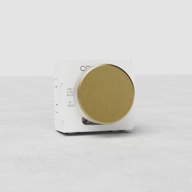 This antique brass rotary dimmer switch works with our Kew and Grove switch plates. It has a collar underneath the rotating knob that hides all the working parts.