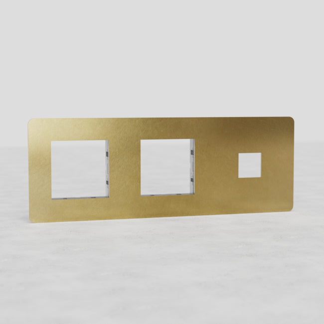 This Kew triple 1x keystone and 2x 45mm module plate in antique brass works with any one of our 20mm keystone modules and any two of our antique brass rocker switches or our 45mm socket modules.