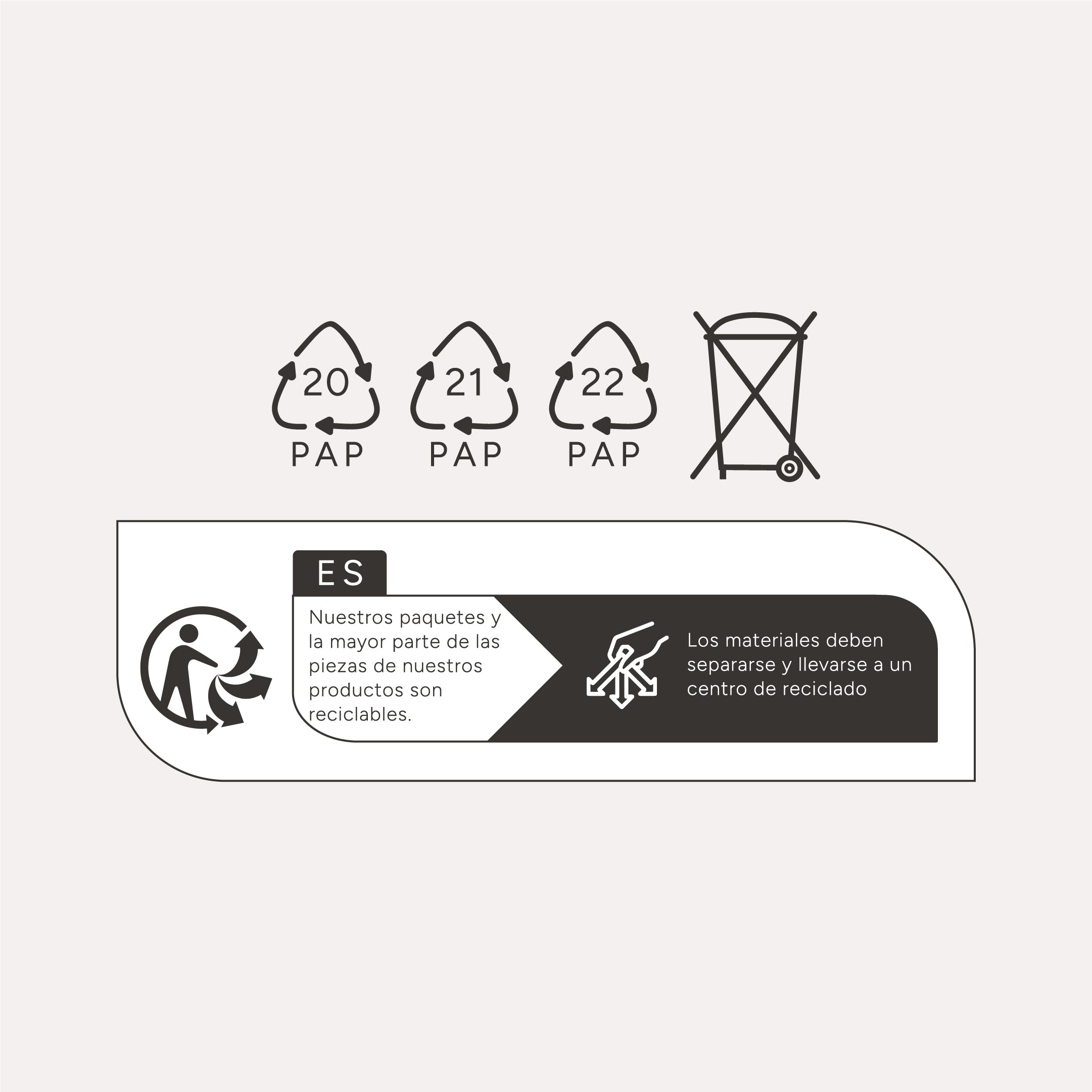 Los códigos indican que nuestras cajas están hechas de cartón (PAP 21) y, para aumentar la integridad estructural de las cajas para el transporte en algunos casos, de cartón ondulado (PAP 20). PAP 22 significa que dentro de la caja habrá un embalaje a base de papel.
