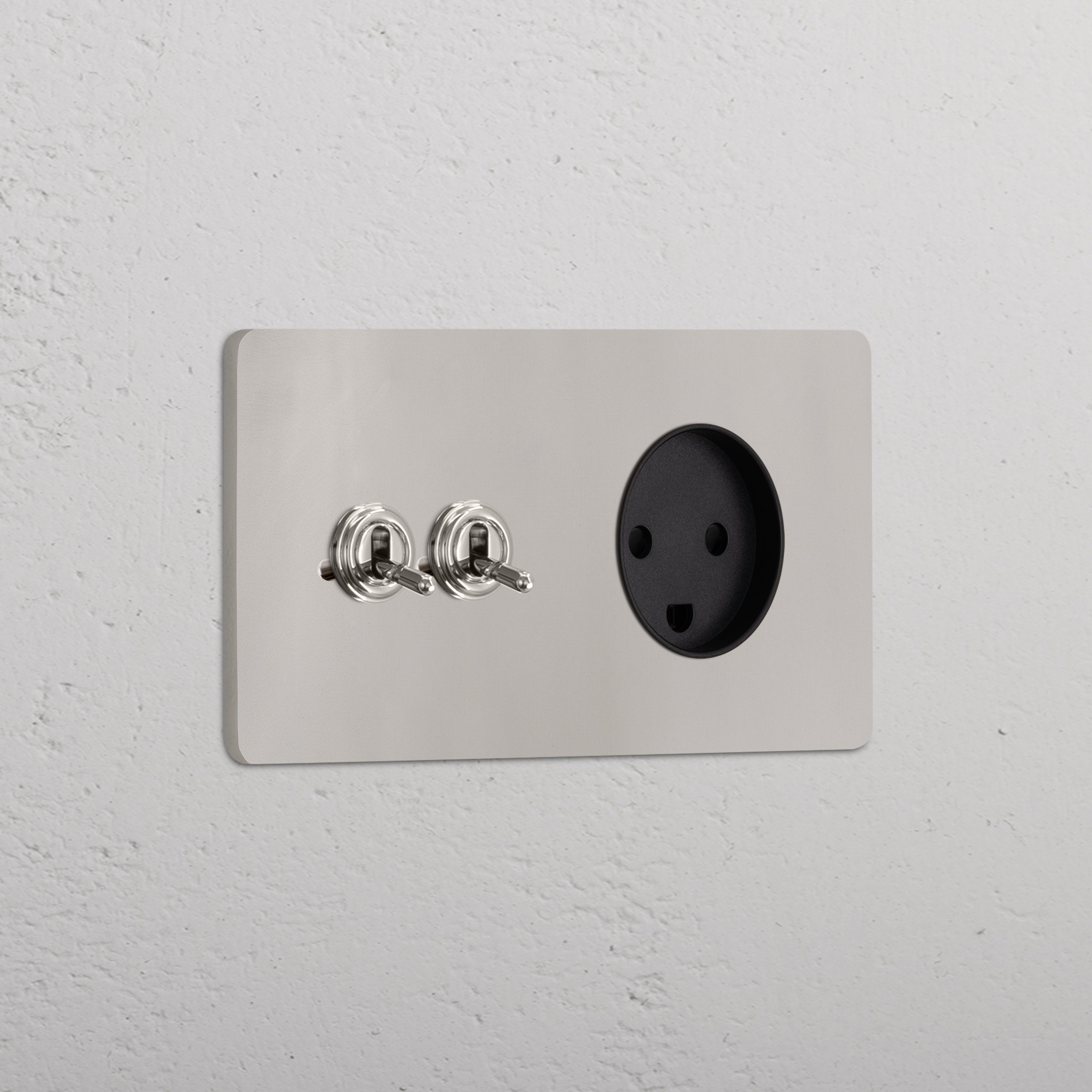Este interruptor y enchufe mixto en marco doble combina dos interruptores conmutadores de palanca y un enchufe danés en un solo marco.