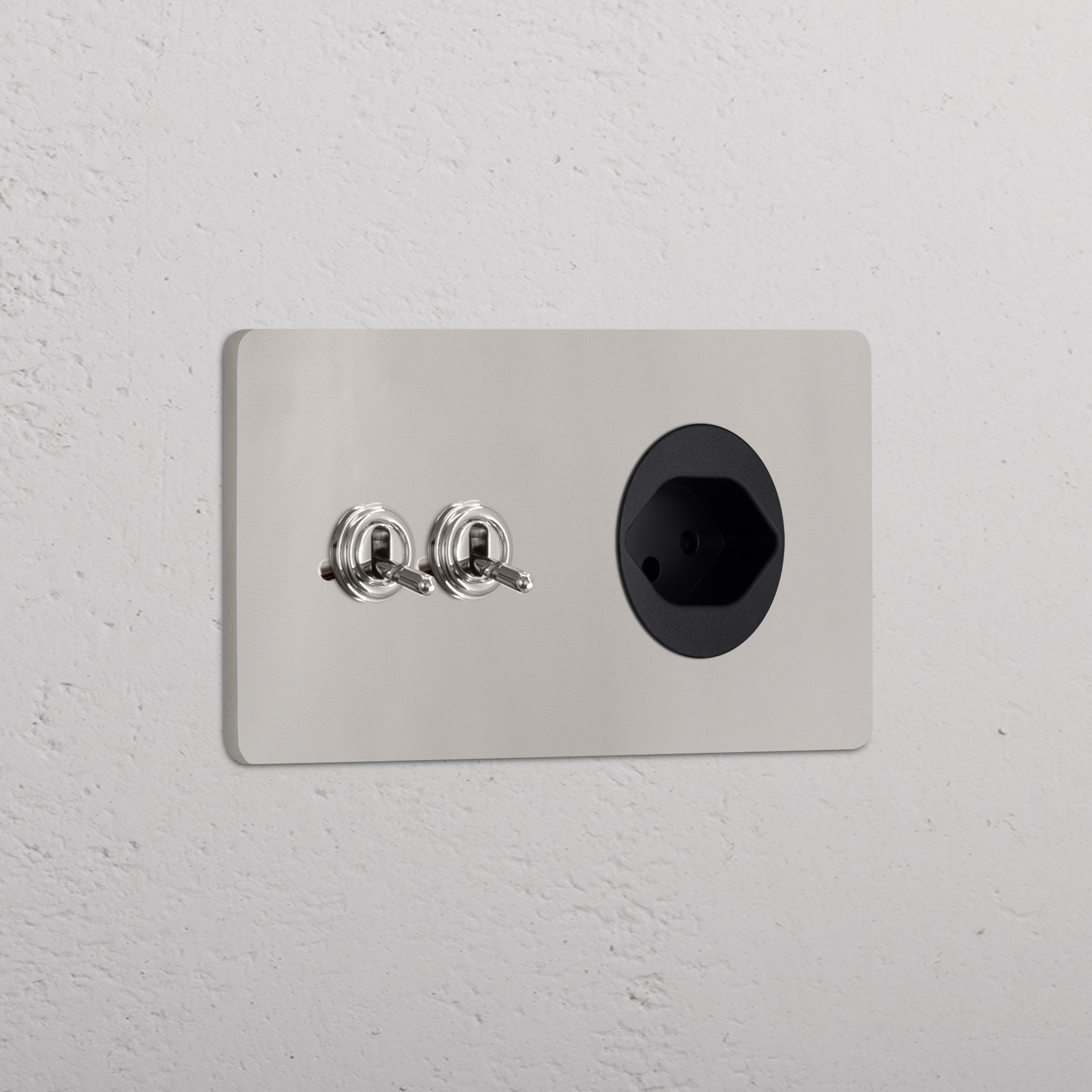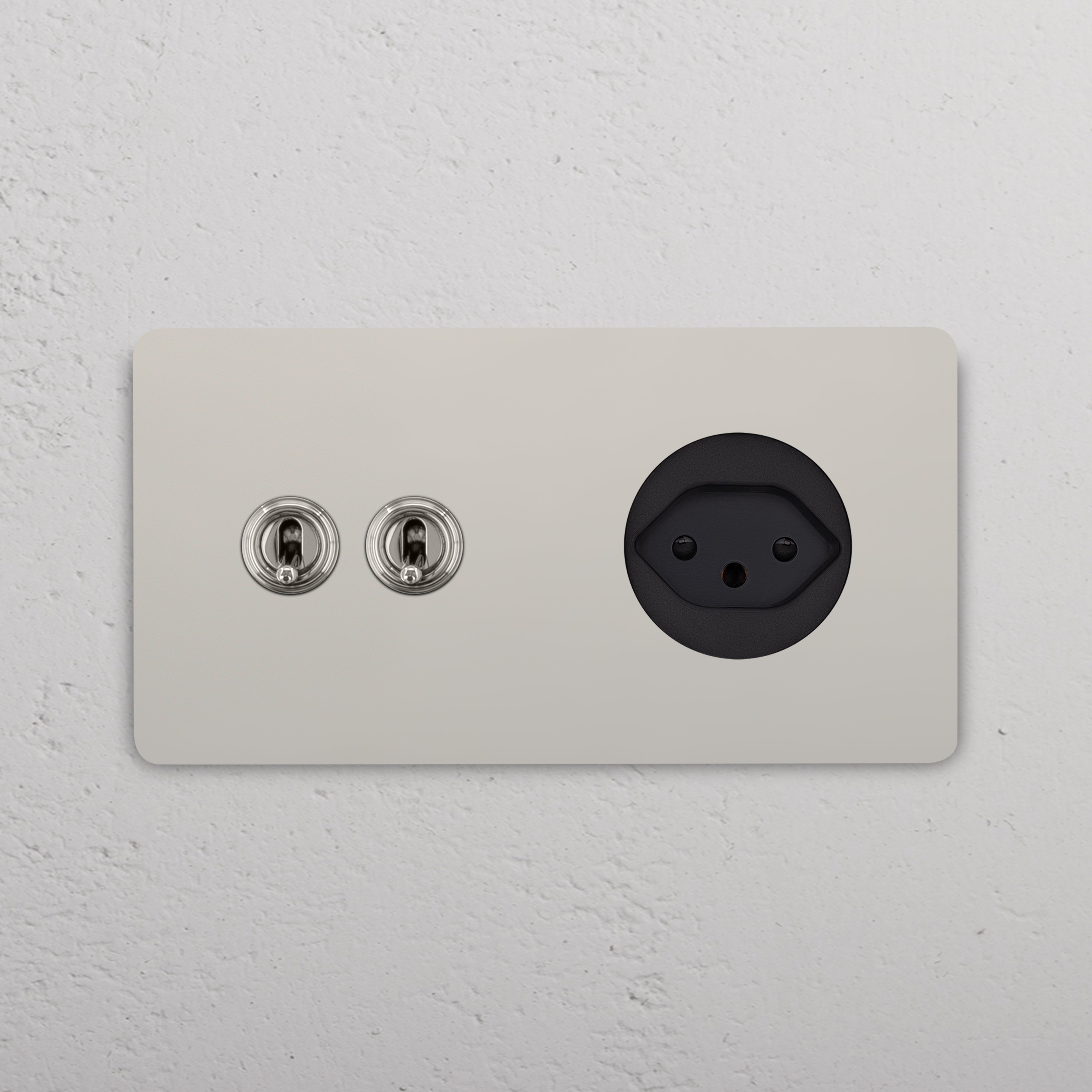 Este interruptor y enchufe mixto en marco doble combina dos interruptores conmutadores de palanca y un enchufe suizo en un solo marco.
