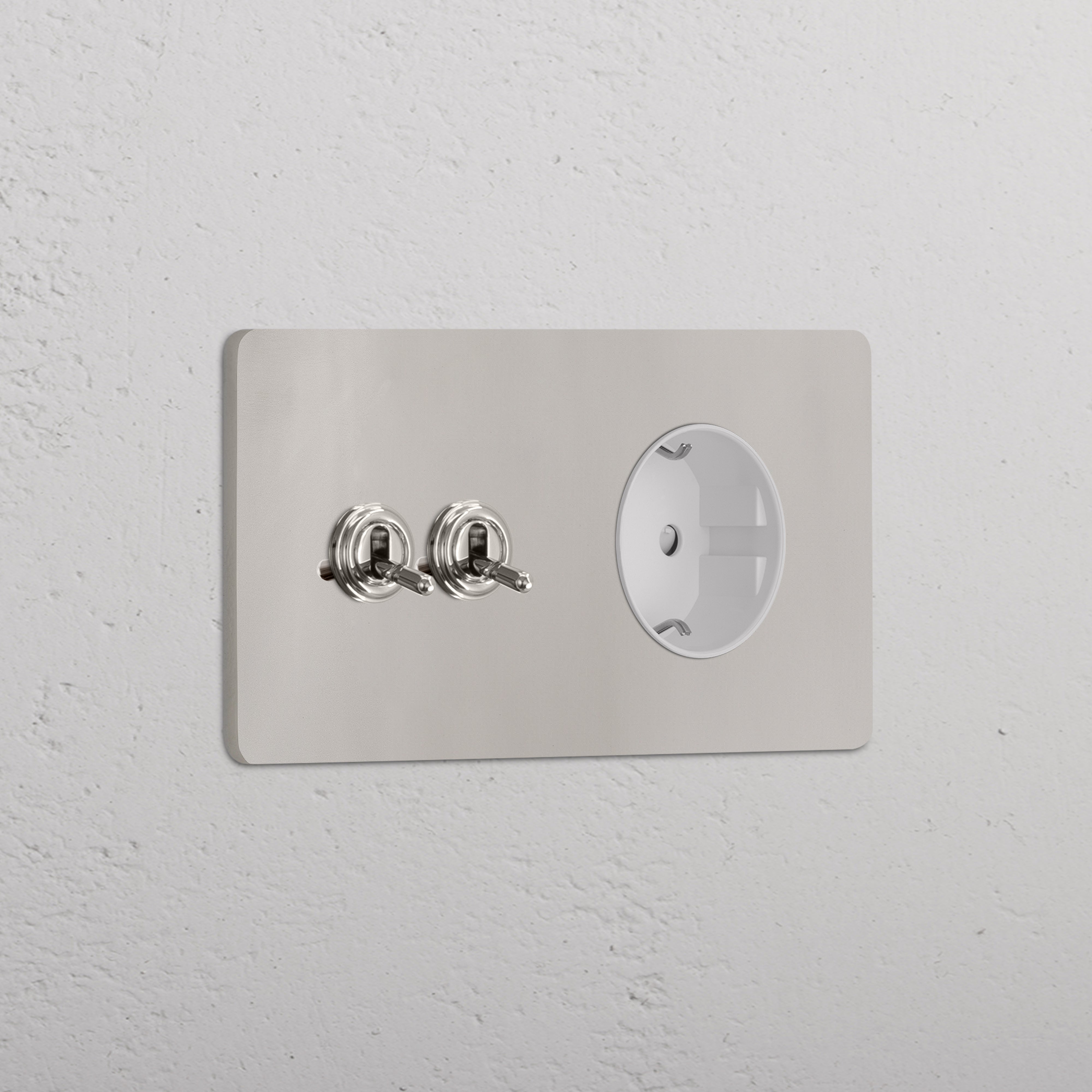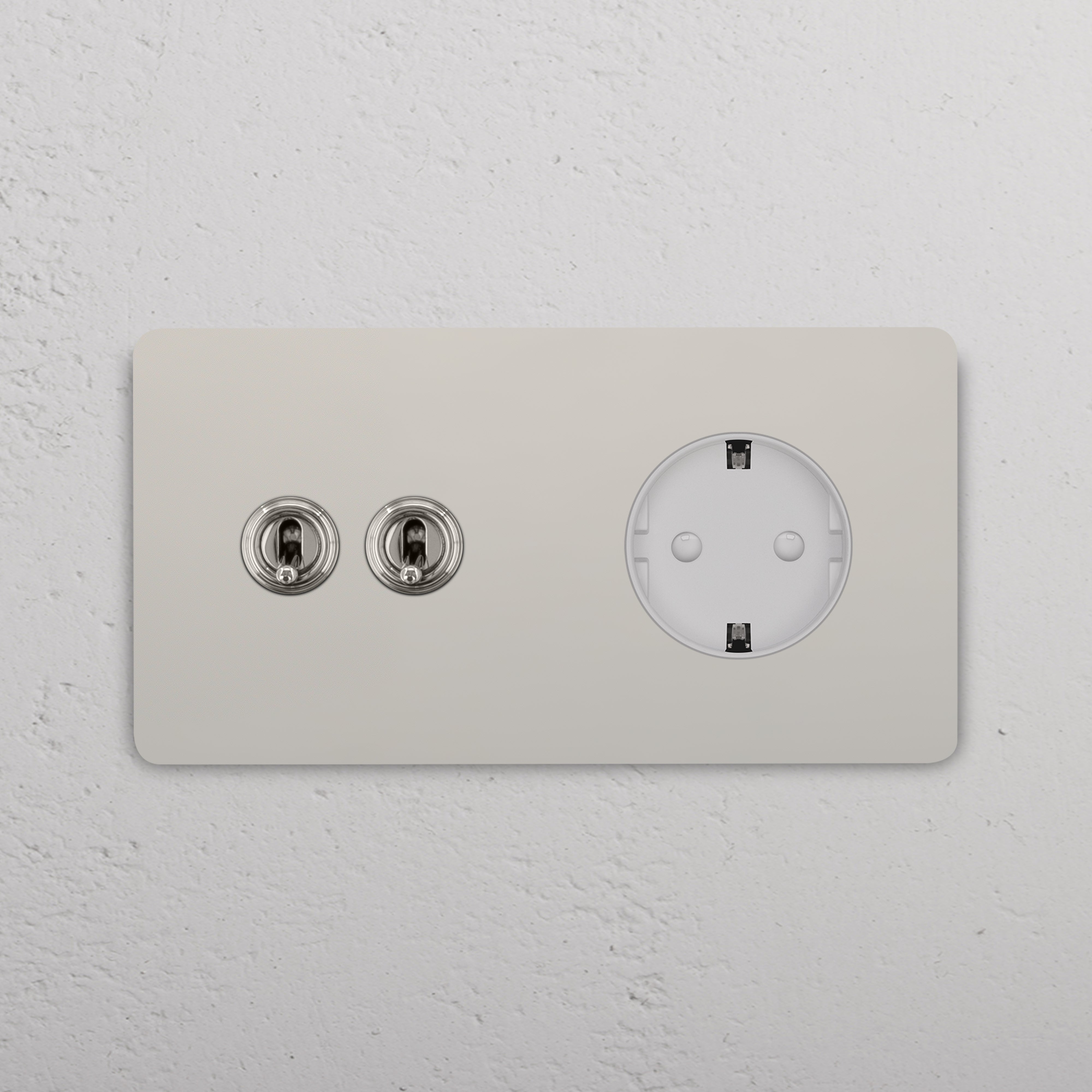 Este interruptor y enchufe mixto en marco doble combina dos interruptores conmutadores de palanca y un enchufe Schuko en un solo marco.