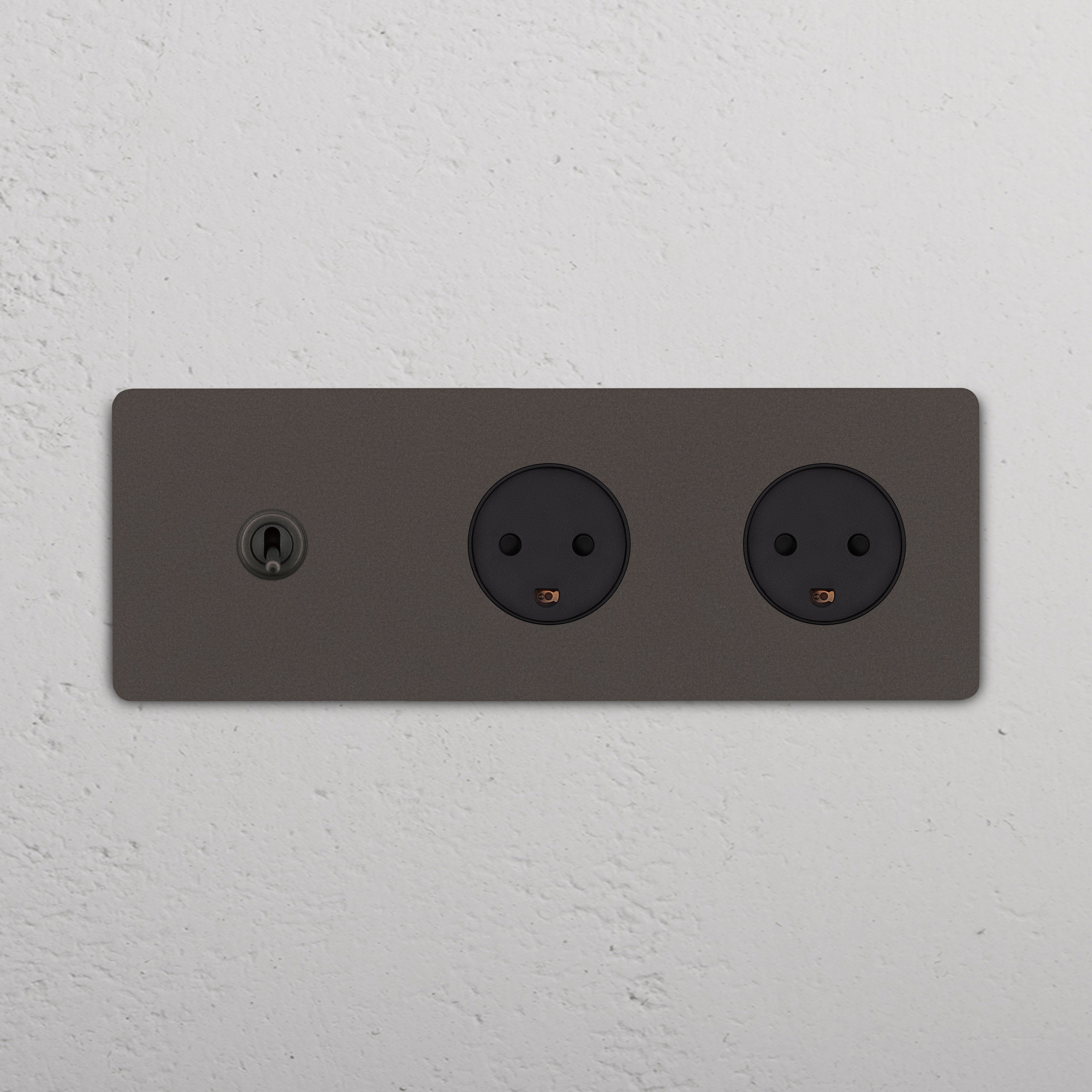 Este interruptor y enchufe mixto en marco triple combina un interruptor conmutador de palanca y dos enchufes daneses en un solo marco.
