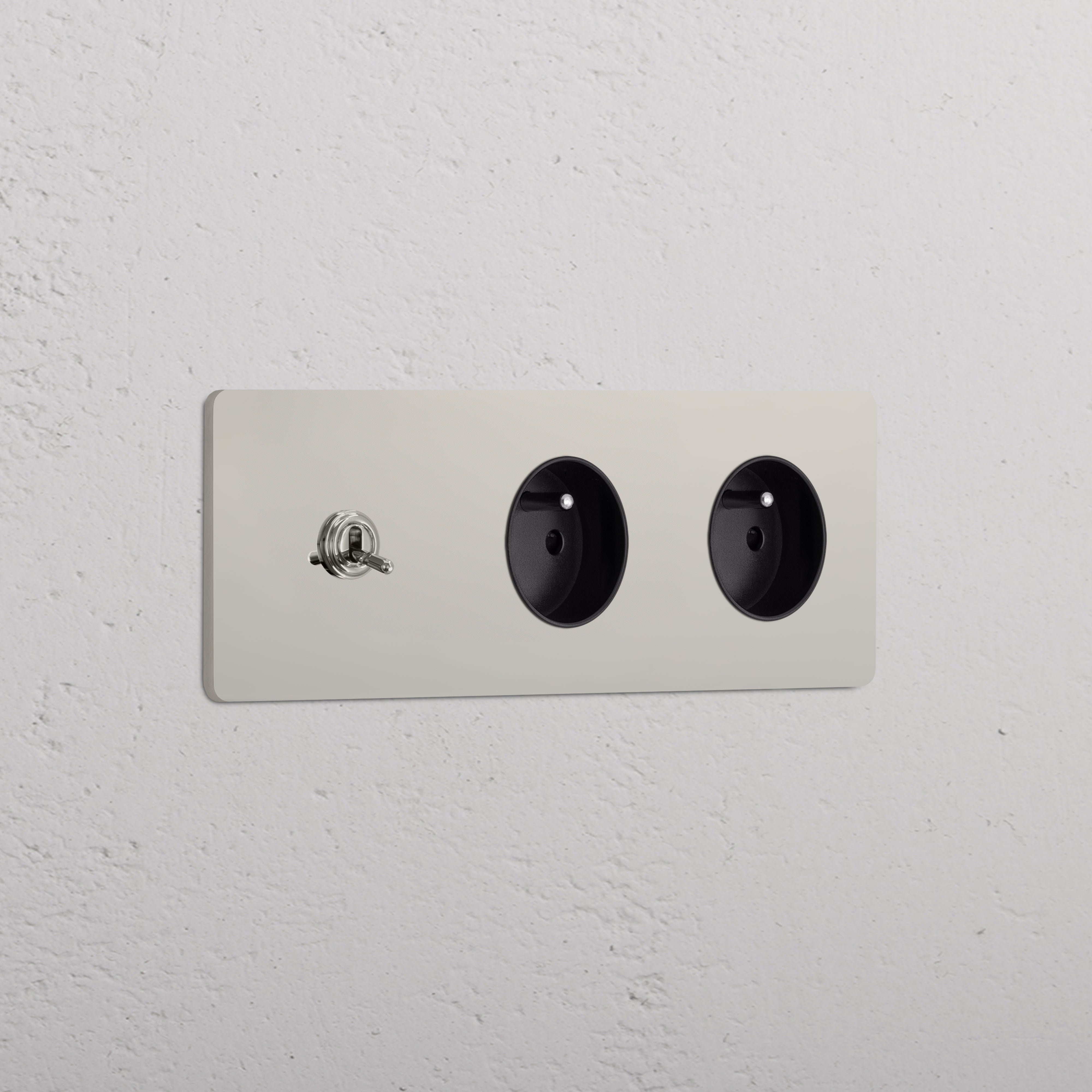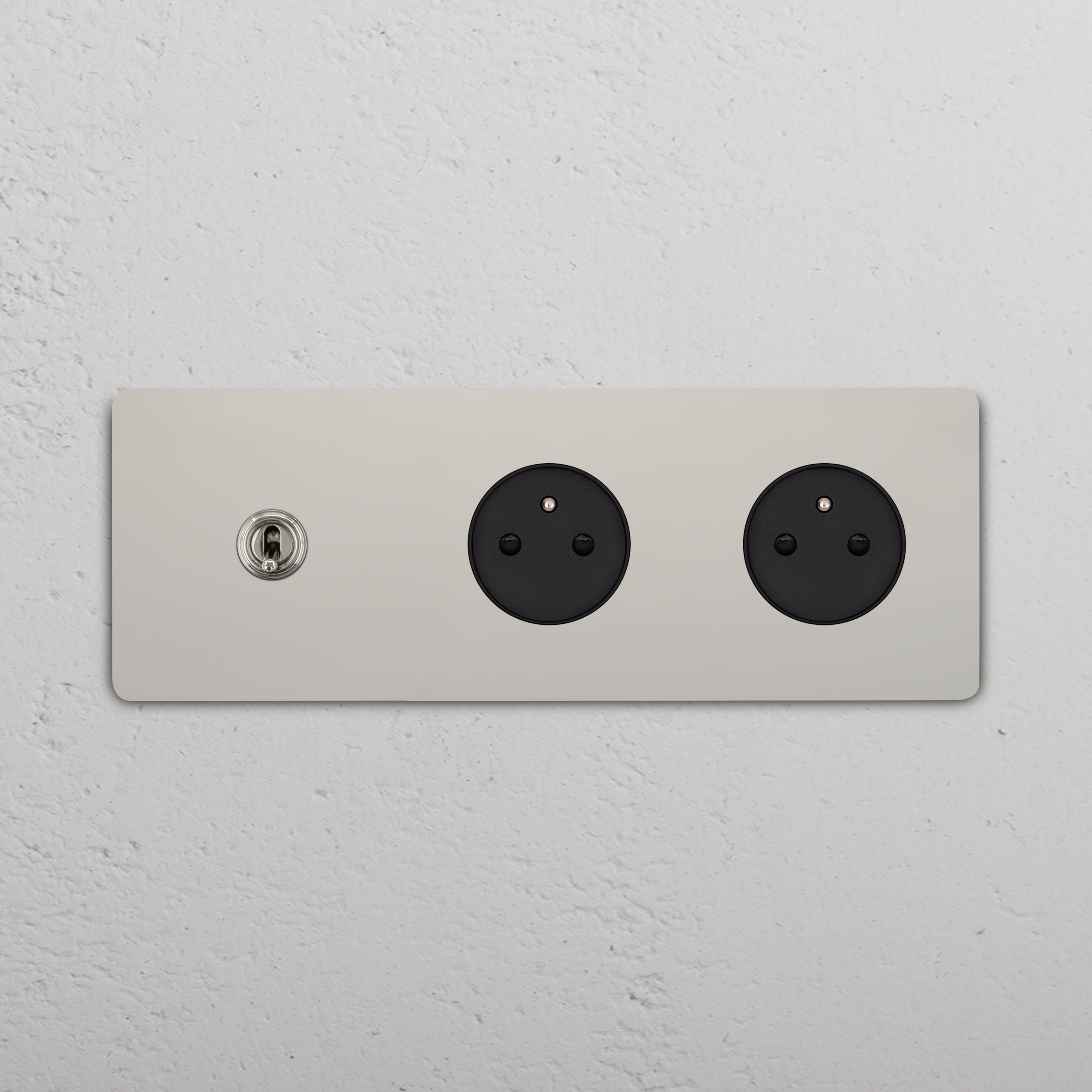 Este interruptor y enchufe mixto en marco triple combina un interruptor conmutador de palanca y dos enchufes francés/belga en un solo marco.