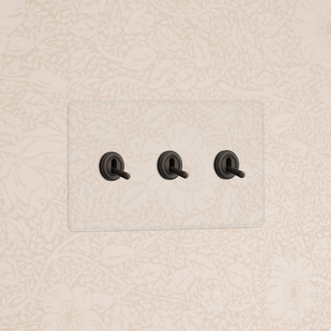 Nous fabriquons notre collection Transparente en polycarbonate, qui est plus flexible et durable que l'acrylique habituel. L'interrupteur va et vient à levier est fabriqué en laiton massif dans notre finition Bronze.