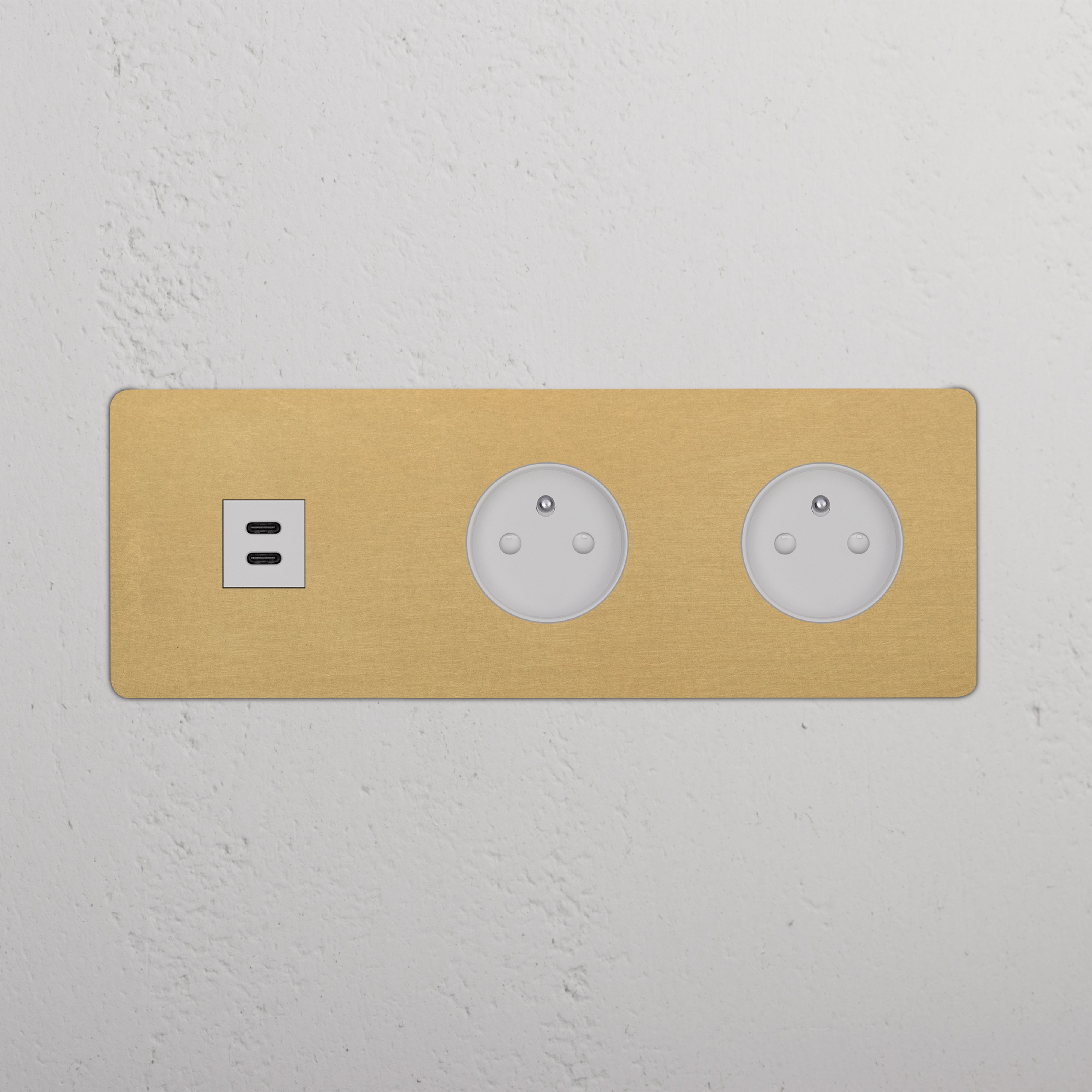 Cette prise mixte sur plaque triple combine une prise USB-C et deux prises France/Belgique sur une même plaque.