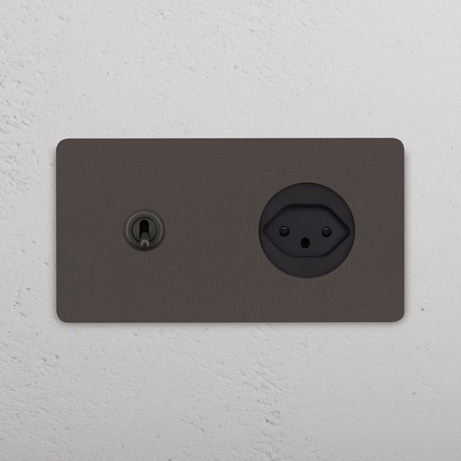 Cet interrupteur et prise mixte sur plaque double combine un interrupteur à levier va-et-vient et une prise Suisse sur une même plaque.