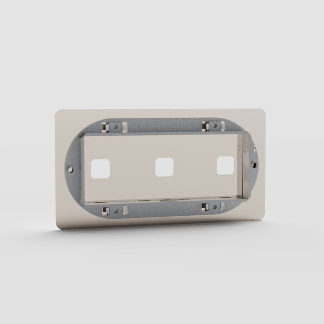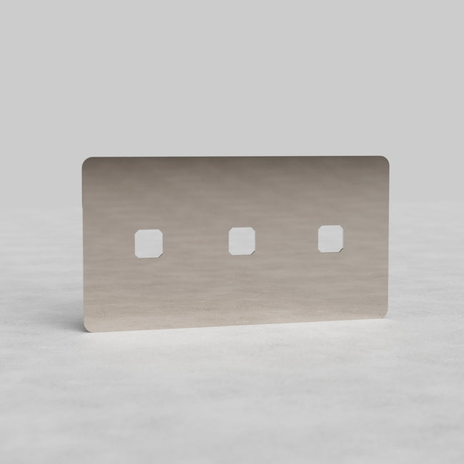 Cette plaque d'insert interrupteur x3 double Kew en nickel poli est compatible avec n'importe quelle combinaison de trois de nos interrupteurs à levier en nickel poli. Si vous souhaitez ajouter un variateur rotatif, vous devrez utiliser notre plaque insert interrupteur x3 triple.
