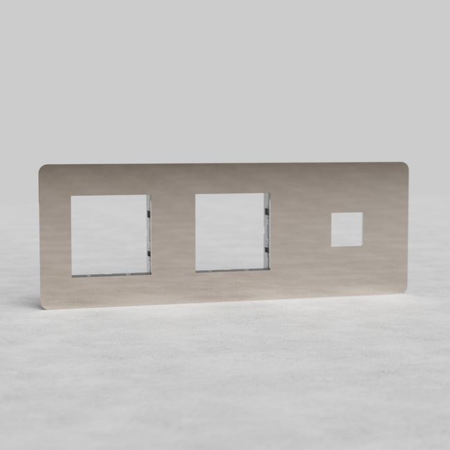 Cette plaque triple d'insert keystone x1 et 45 mm x2 Kew en nickel poli est compatible avec n'importe lequel de nos mécanismes keystone de 20 mm et n'importe quelle combinaison de deux de nos mécanismes d'interrupteur carré en nickel poli ou de prise 45 mm.