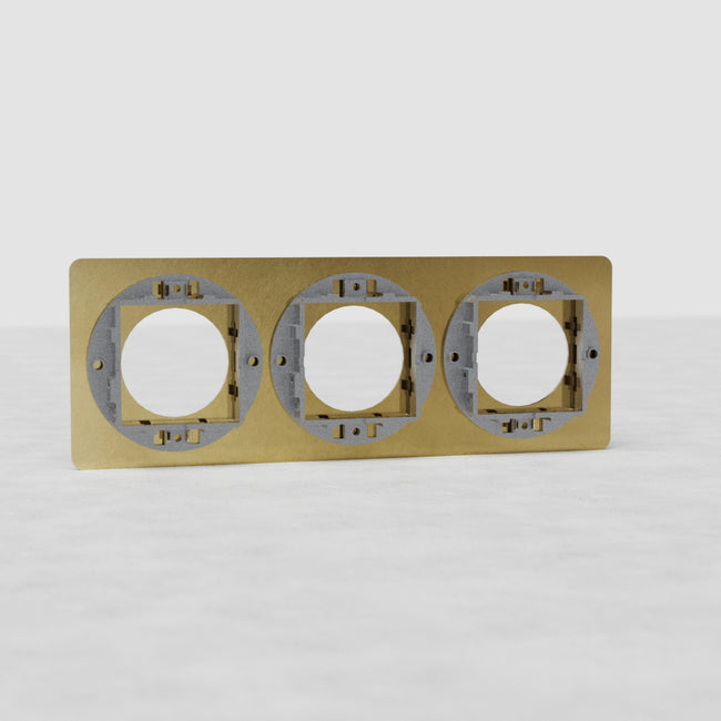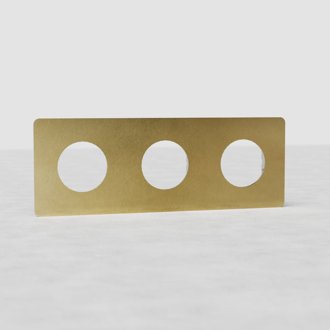 Cette plaque de prise triple Kew en laiton ancien est compatible avec n'importe quelle combinaison de trois de nos mécanismes de prise ronde.