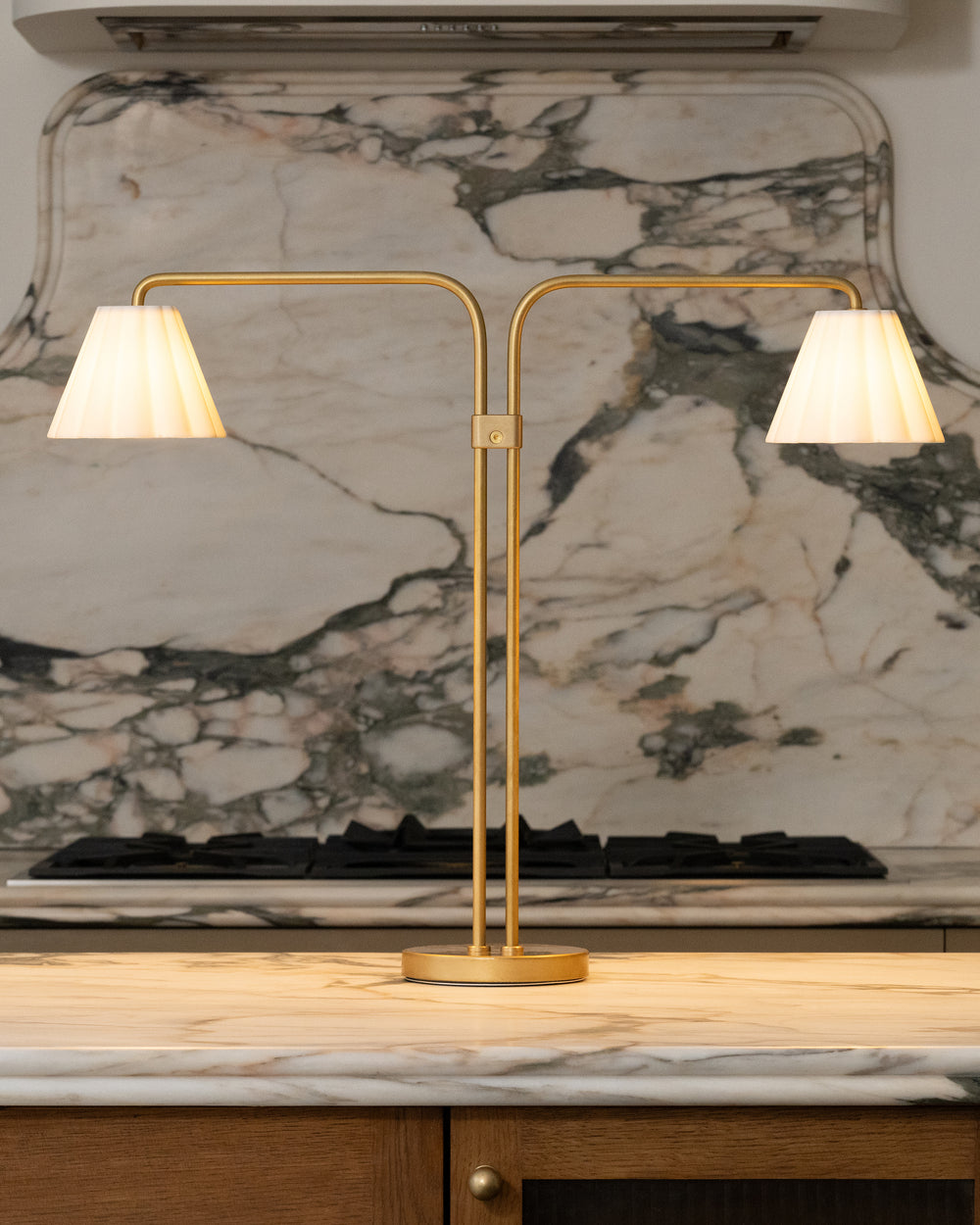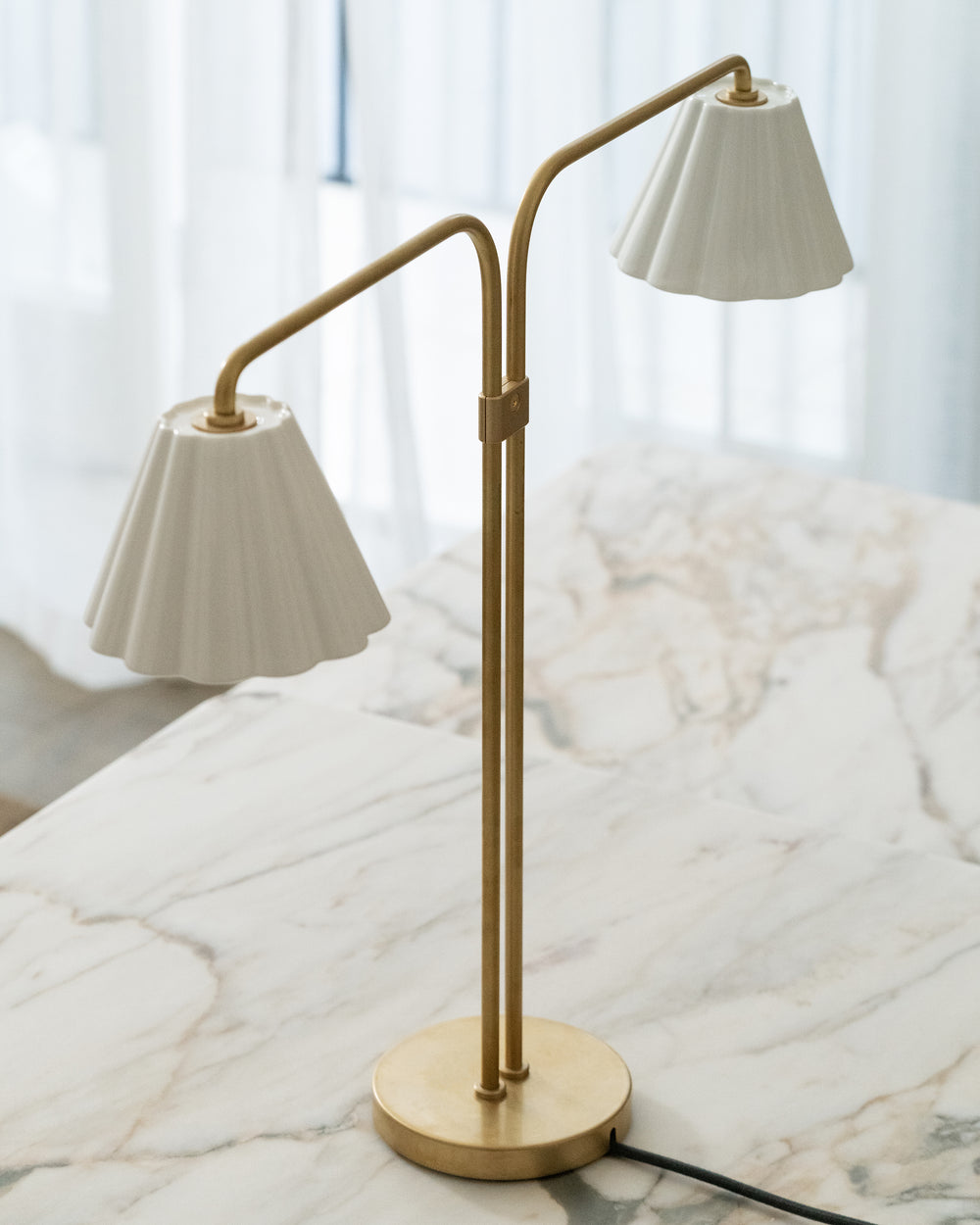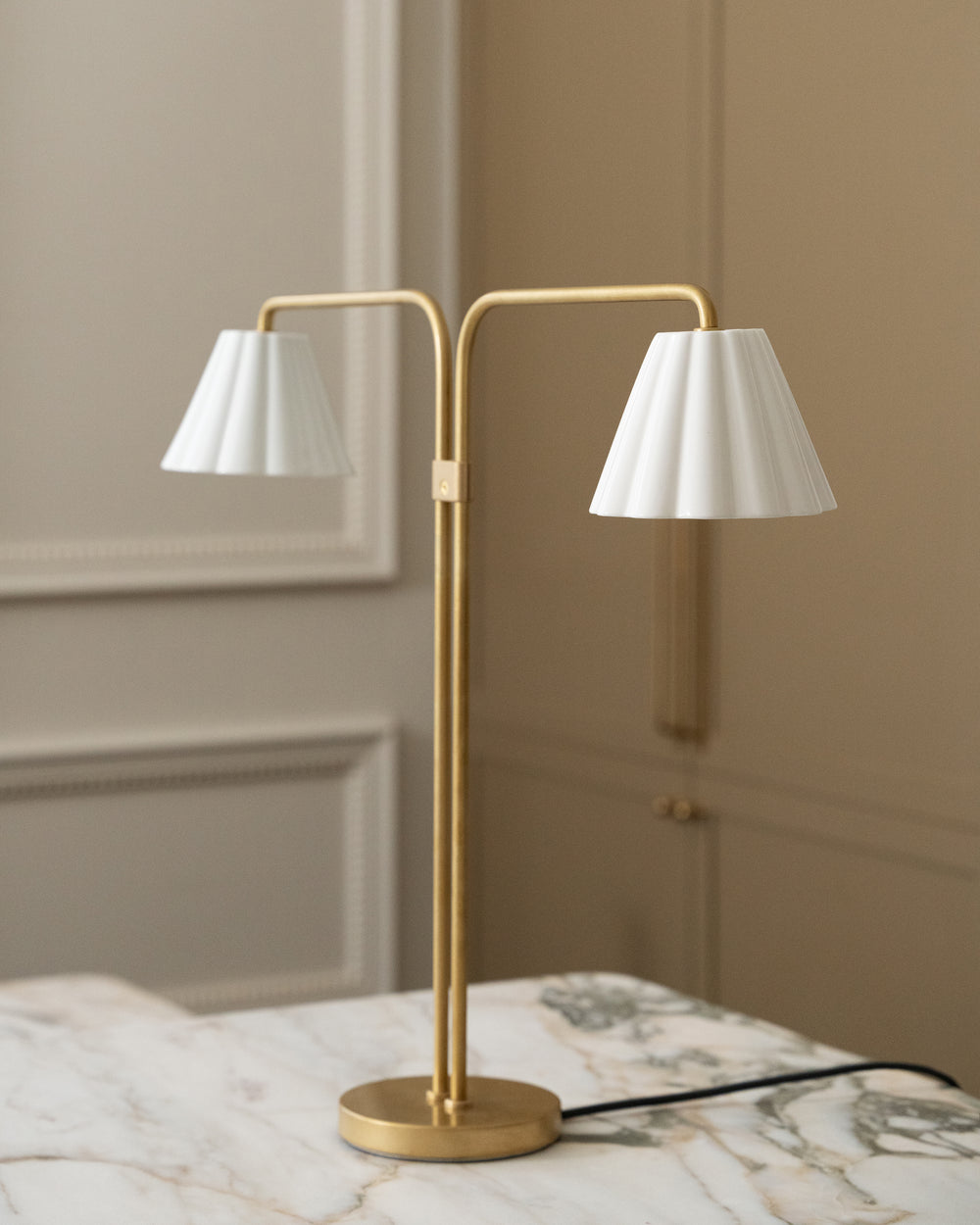 Cette lampe de table double est basée sur un modèle sur mesure que nous avons créé pour notre propre siège social.