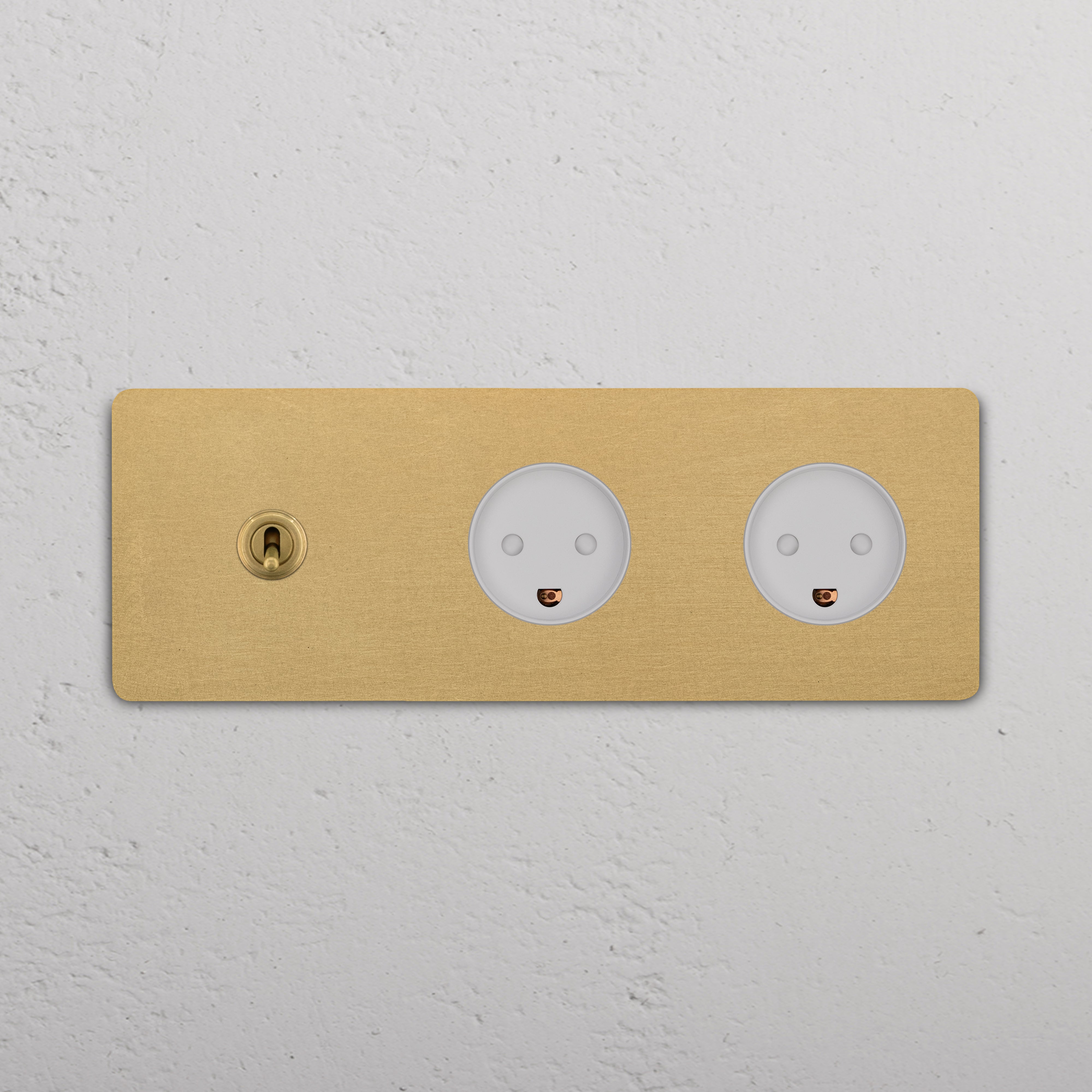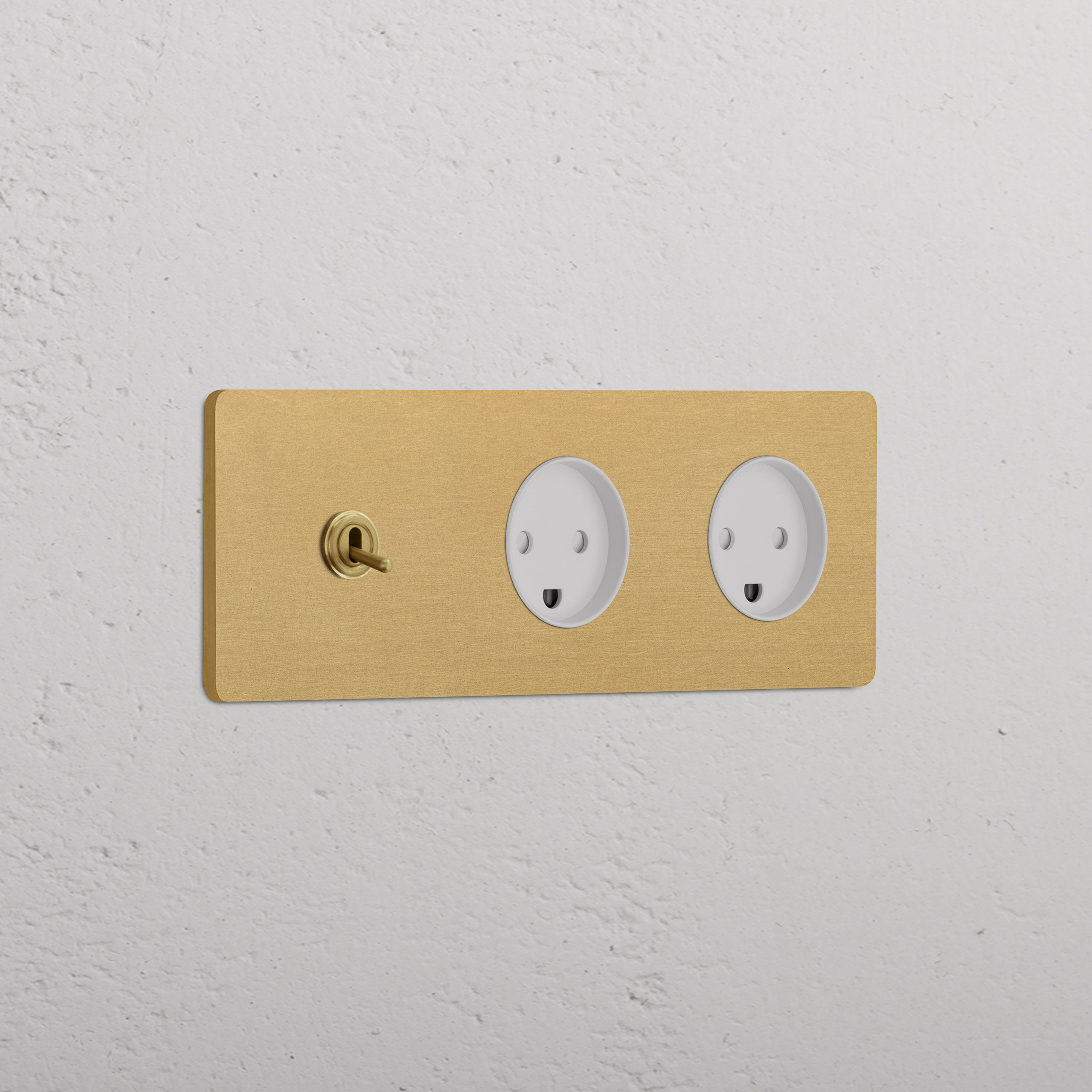 Cet interrupteur et prise mixte sur plaque triple combine un interrupteur à levier va-et-vient et deux prises Danemark sur une même plaque.