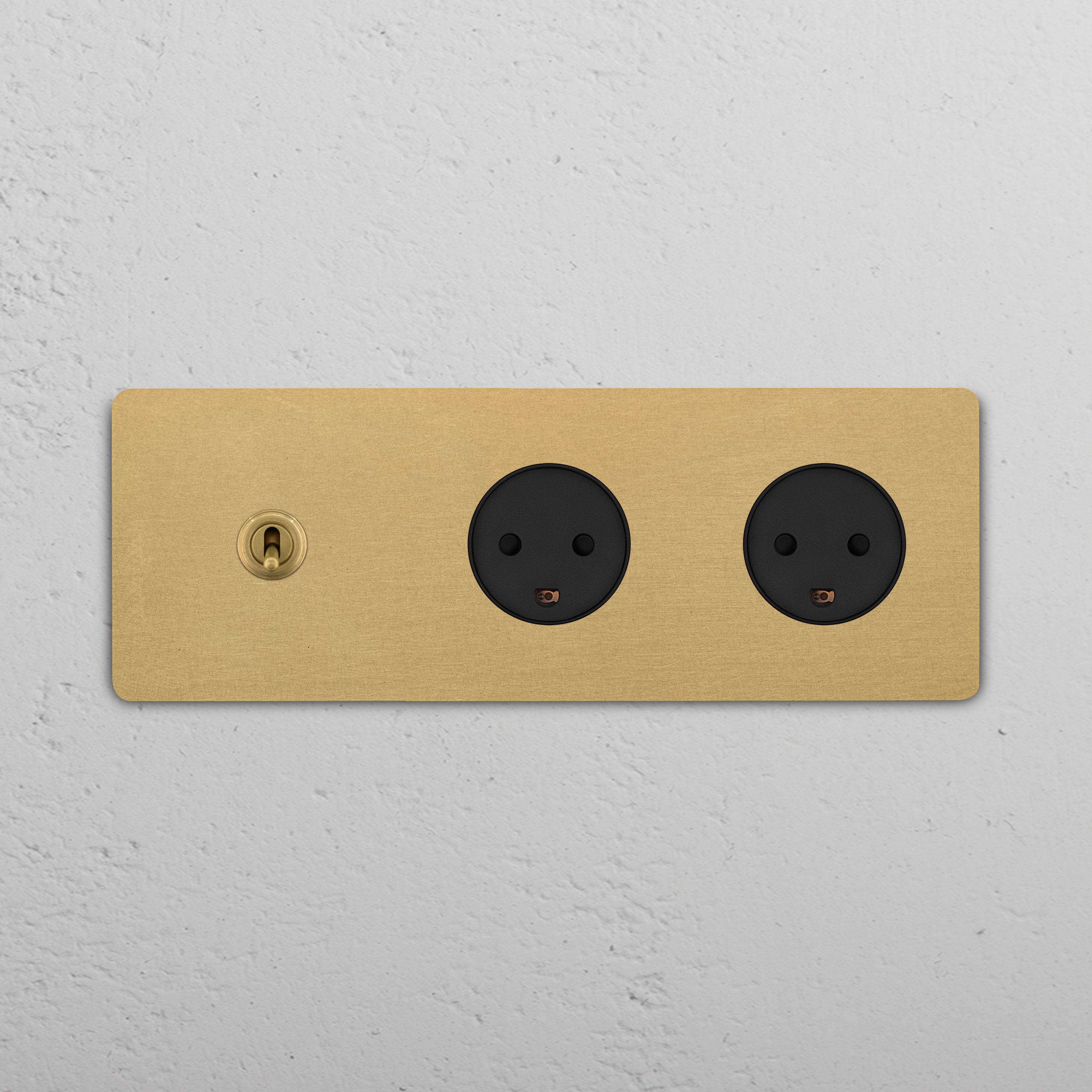 Cet interrupteur et prise mixte sur plaque triple combine un interrupteur à levier va-et-vient et deux prises Danemark sur une même plaque.