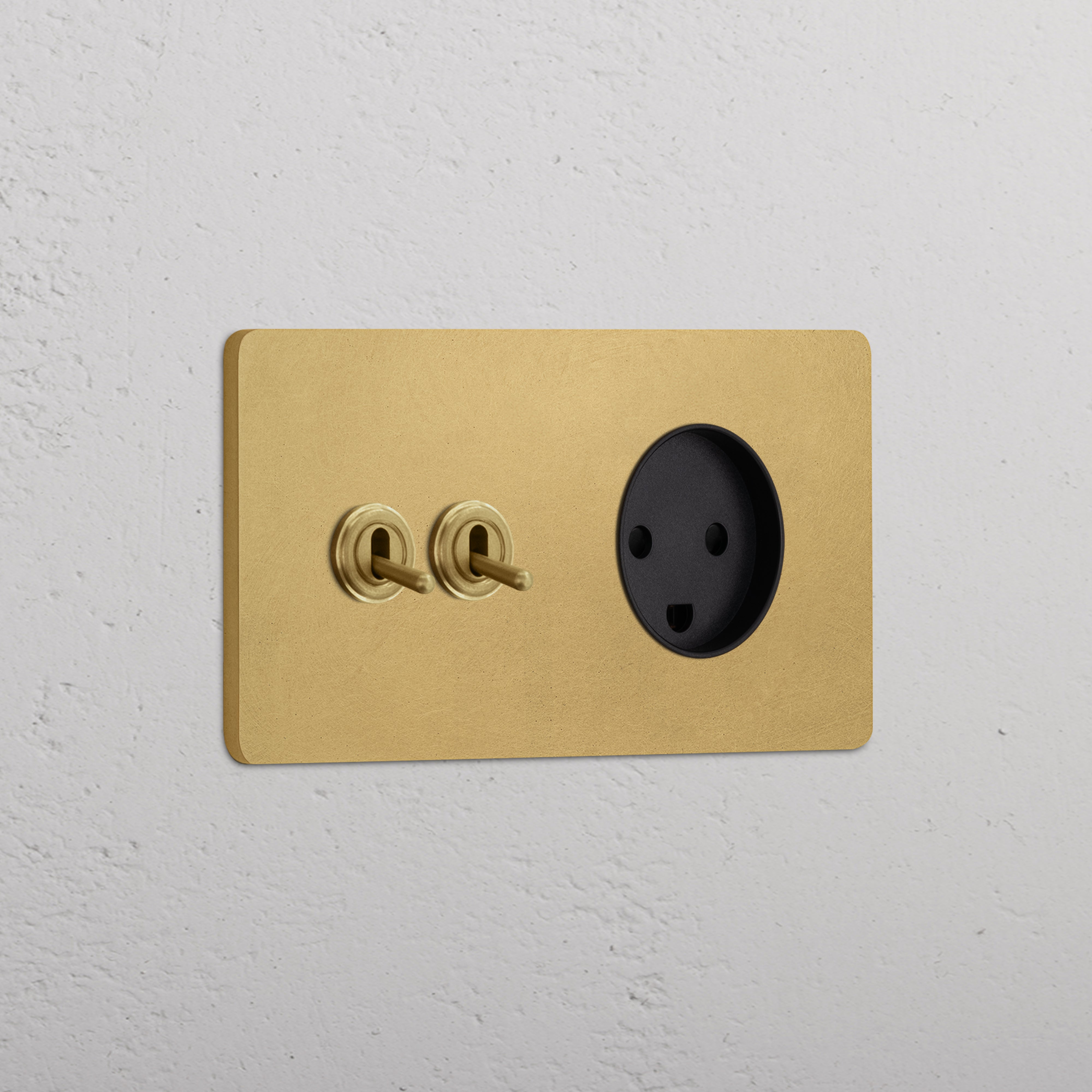 Cet interrupteur et prise mixte sur plaque double combine deux interrupteurs à levier va-et-vient et une prise Danemark sur une même plaque.