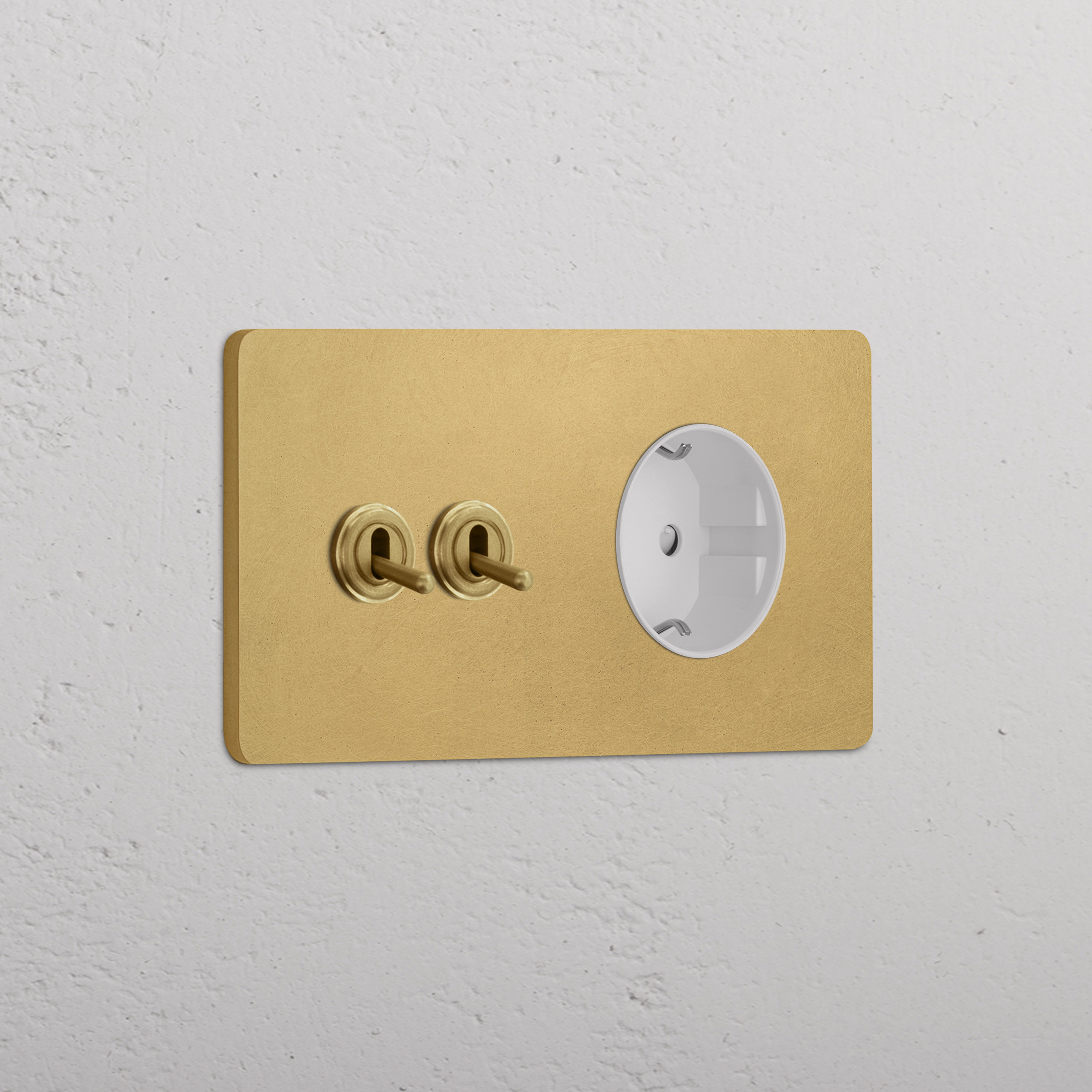 Cet interrupteur et prise mixte sur plaque double combine deux interrupteurs à levier va-et-vient et une prise Schuko sur une même plaque.