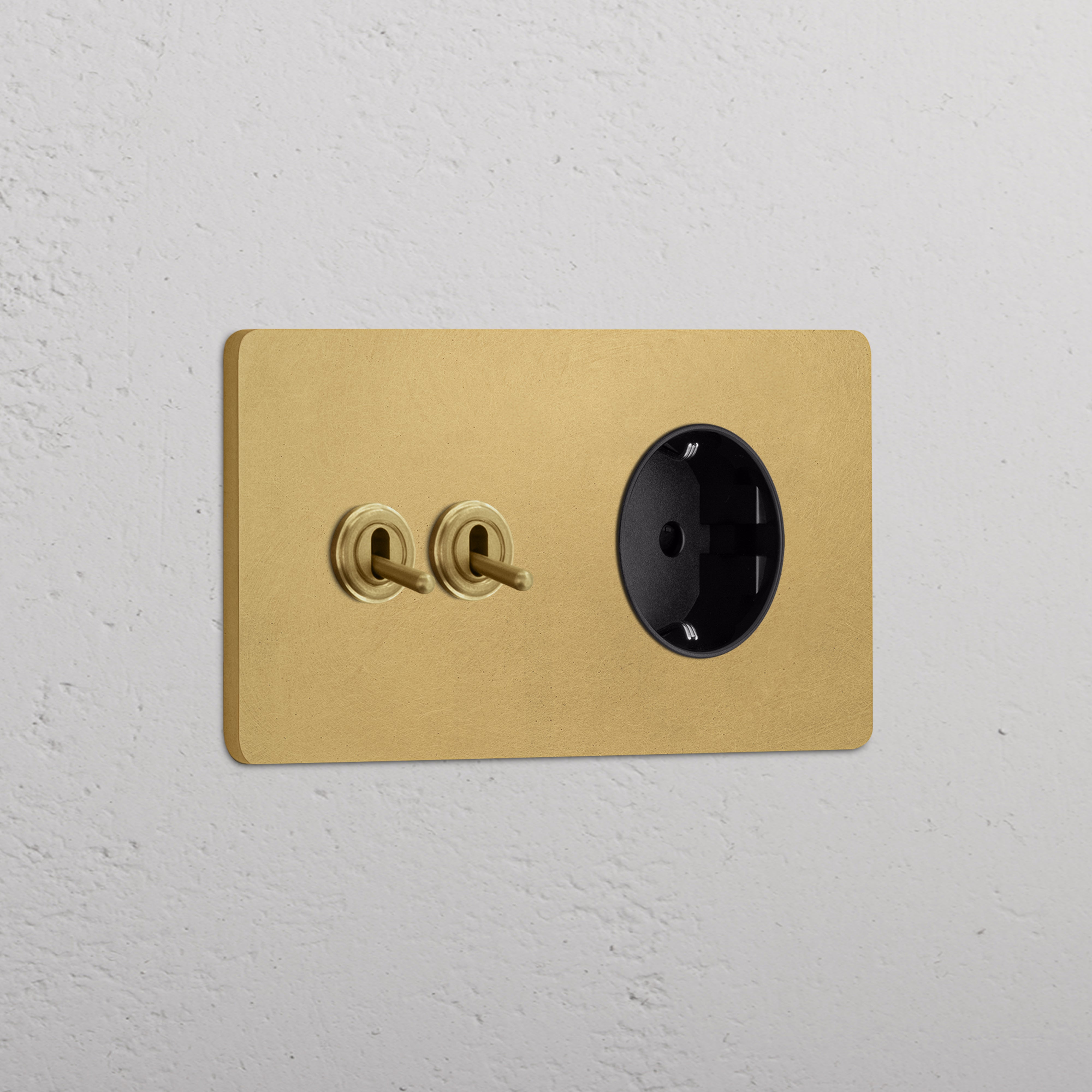 Cet interrupteur et prise mixte sur plaque double combine deux interrupteurs à levier va-et-vient et une prise Schuko sur une même plaque.
