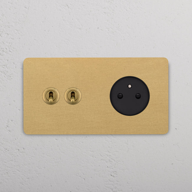 Questo modulo misto doppio combina due deviatori a levetta e una presa francese/belga su un’unica placca.