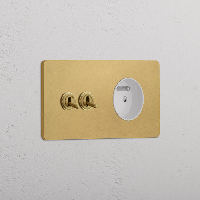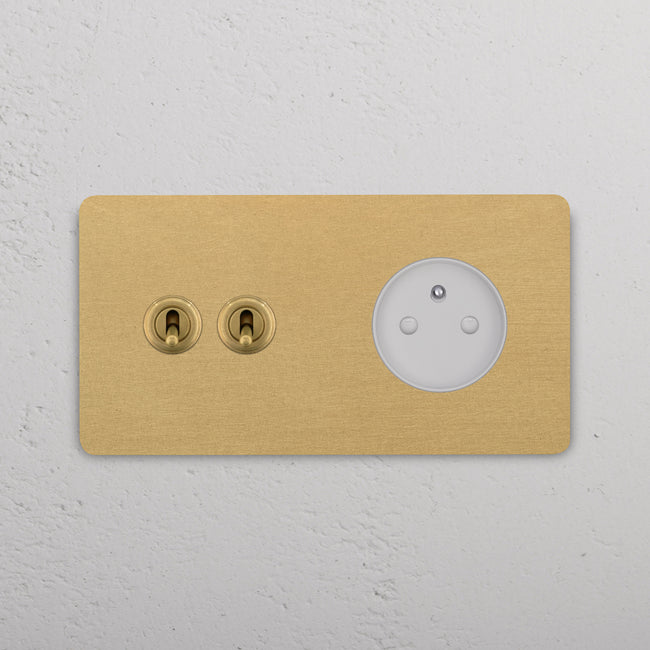 Questo modulo misto doppio combina due deviatori a levetta e una presa francese/belga su un’unica placca.