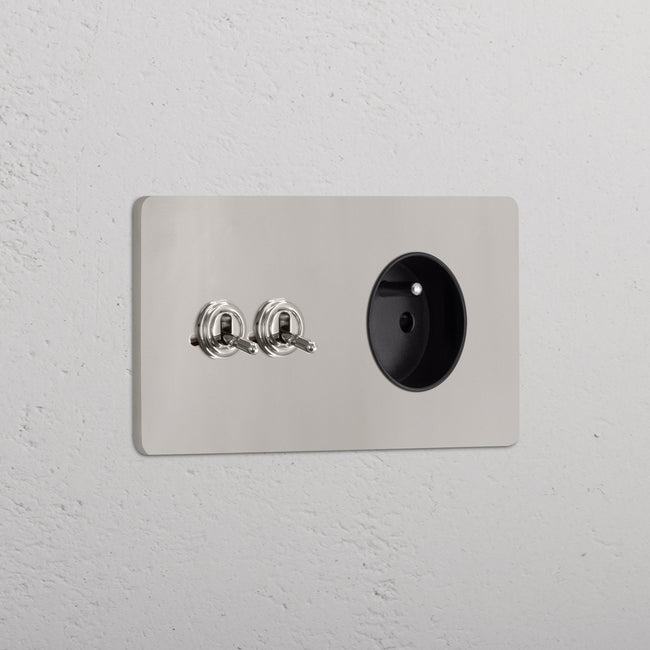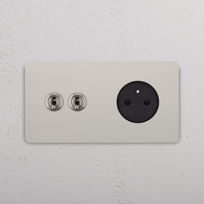 Questo modulo misto doppio combina due deviatori a levetta e una presa francese/belga su un’unica placca.