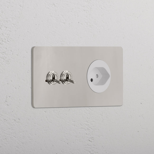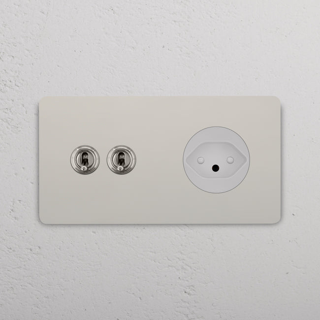 Questo modulo misto doppio combina due deviatori a levetta e una presa svizzera su un’unica placca.