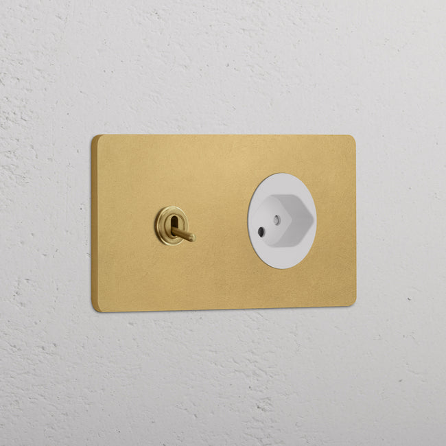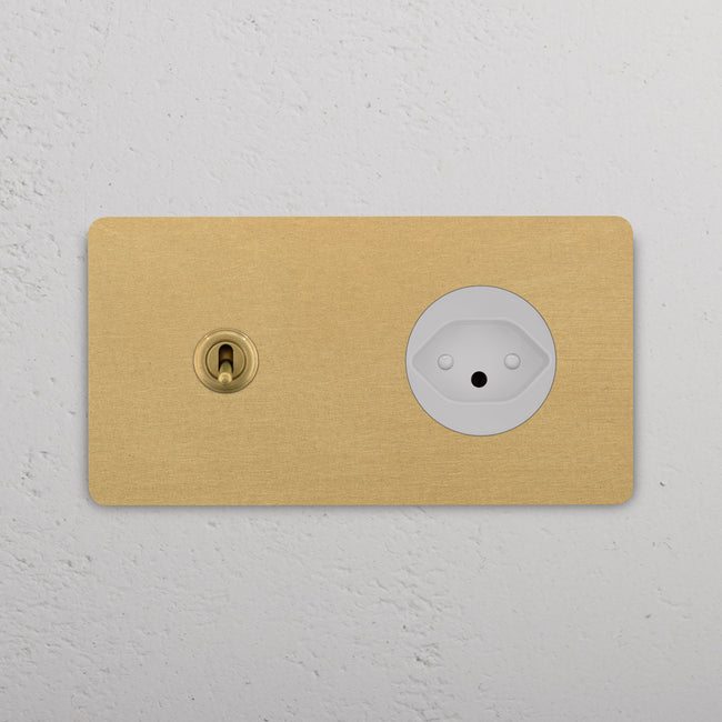 Questo modulo misto doppio combina un deviatore a levetta e una presa svizzera su un’unica placca.