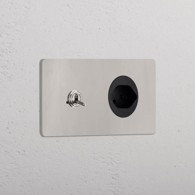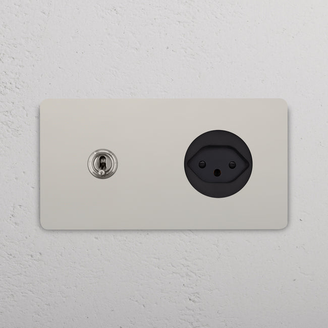 Questo modulo misto doppio combina un deviatore a levetta e una presa svizzera su un’unica placca.
