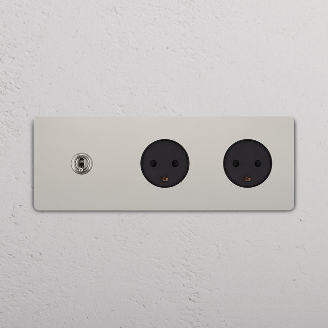 Questo modulo misto triplo combina un deviatore a levetta e due prese danesi su un’unica placca.