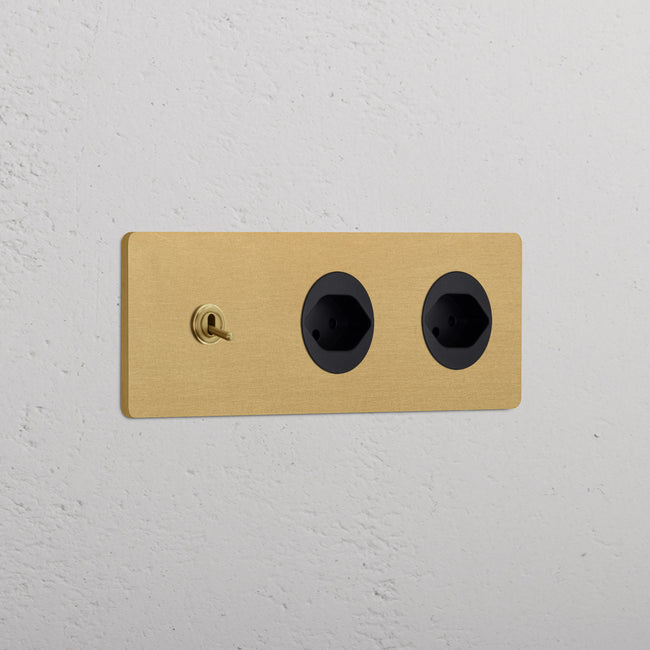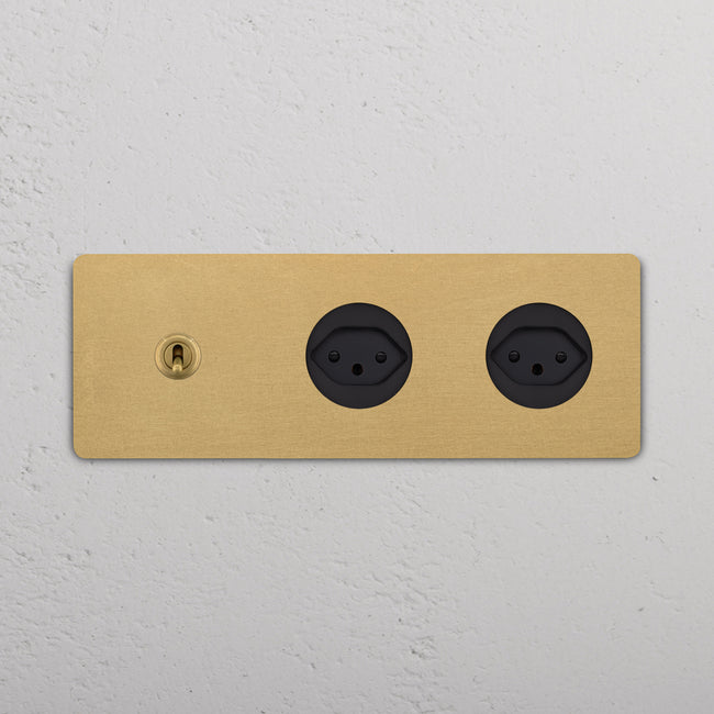 Questo modulo misto triplo combina un deviatore a levetta e due prese svizzere su un’unica placca.