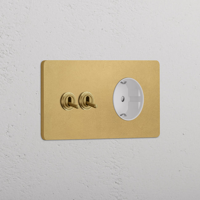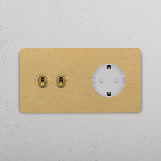 Questo modulo misto doppio combina due deviatori a levetta e una presa Schuko su un’unica placca.