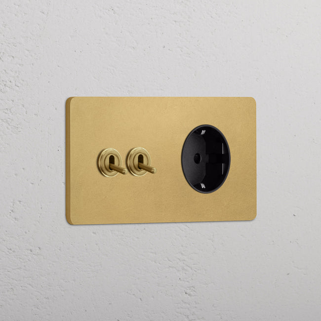 Questo modulo misto doppio combina due deviatori a levetta e una presa Schuko su un’unica placca.