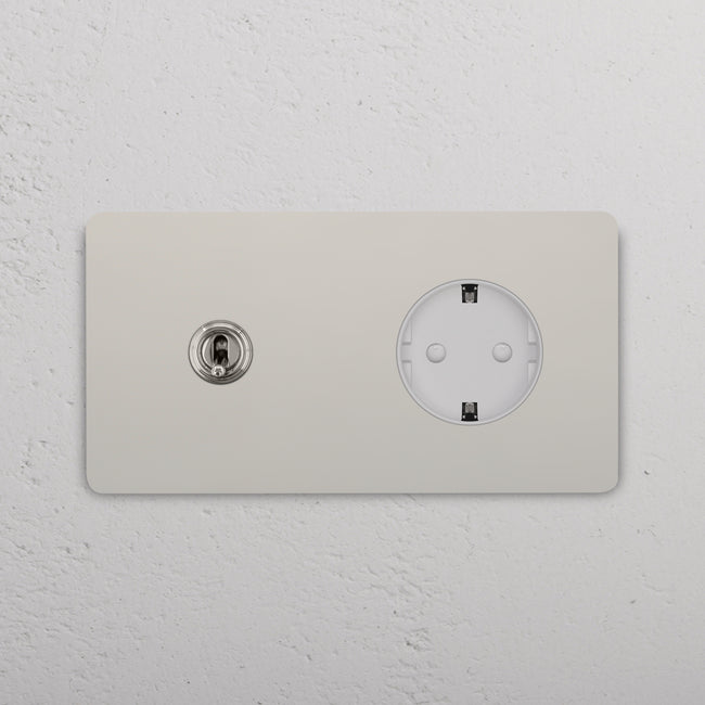 Questo modulo misto doppio combina un deviatore a levetta e una presa Schuko su un’unica placca.