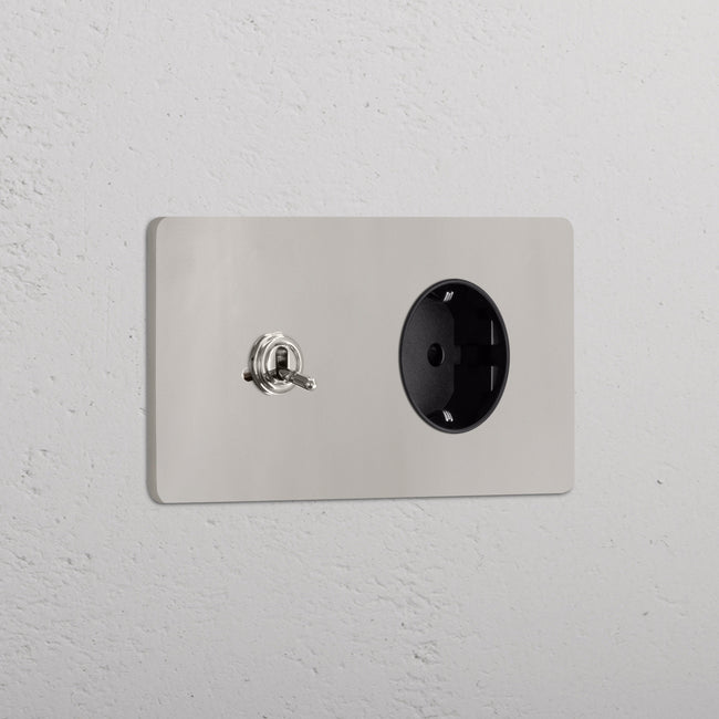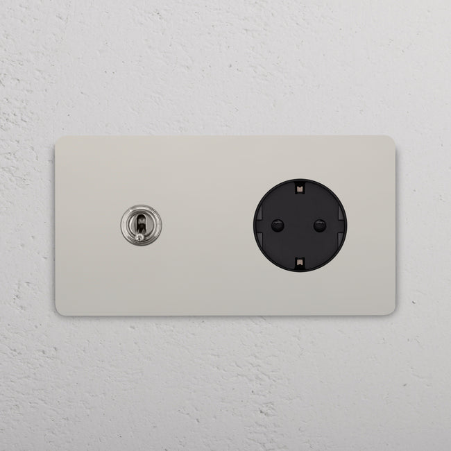 Questo modulo misto doppio combina un deviatore a levetta e una presa Schuko su un’unica placca.