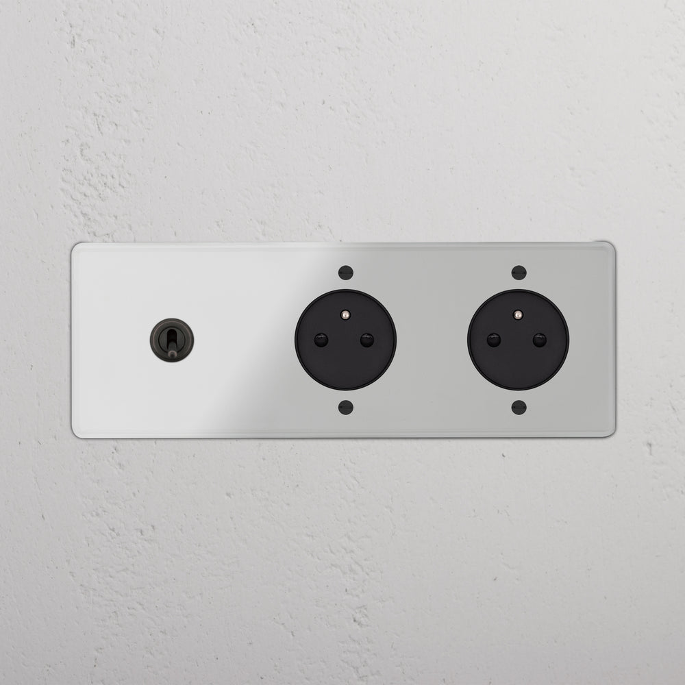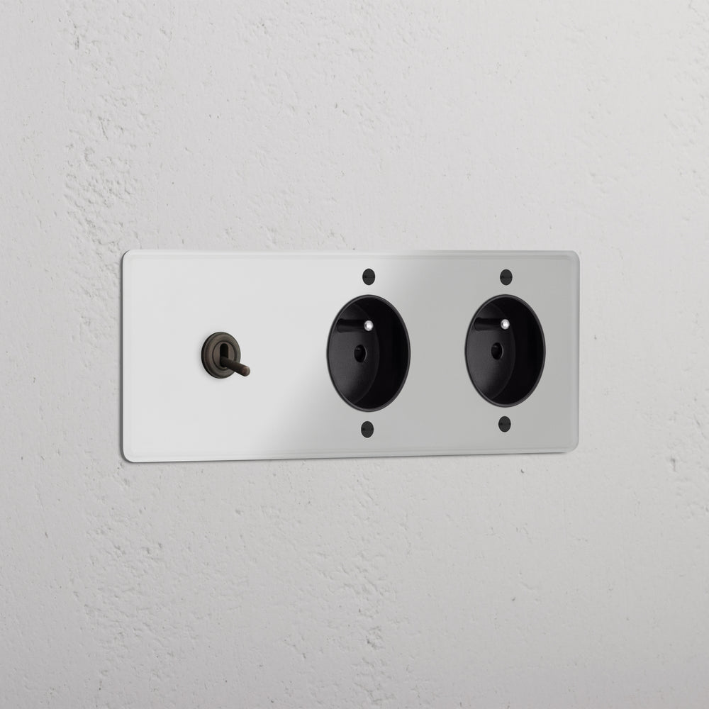 Questo modulo misto triplo combina un deviatore a levetta e due prese francesi/belghe su un’unica placca.