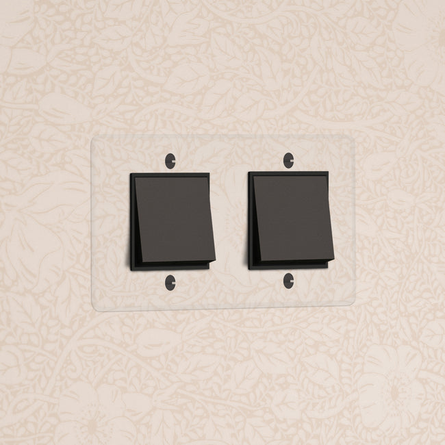 Onze transparante collectie is gemaakt van polycarbonaat, dat flexibeler en duurzamer is dan het gebruikelijke acryl. De wipschakelaars zijn gemaakt van massief messing met onze bronzen afwerking.