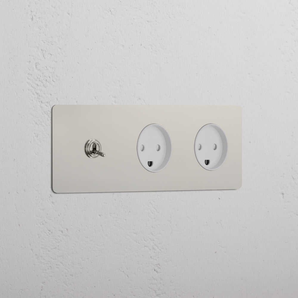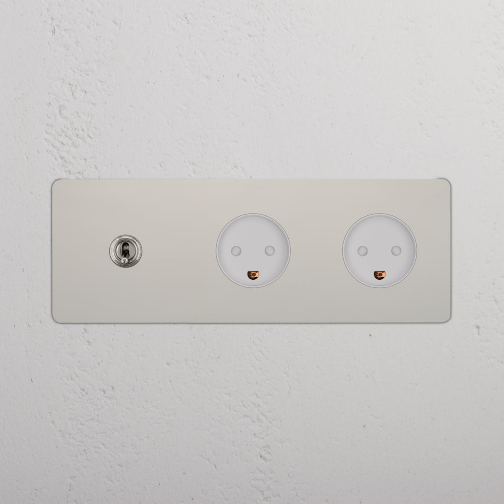 This triple mixed switch and socket combines a two-way toggle switch and two Danish sockets on one plate.