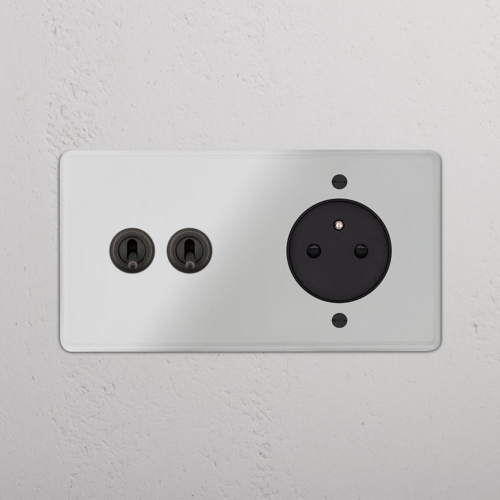 This double mixed switch and socket combines two two-way toggle switches and a French/Belgian socket on one plate.