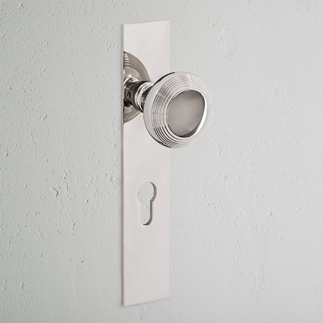 Simplificámos as linhas, criando uma maçaneta mais plana e, neste caso, um espelho comprido de baixo perfil que concebemos para uso com cilindro europeu. Ficará excelente em propriedades de época com um toque contemporâneo ou dará um toque tradicional a construções novas.