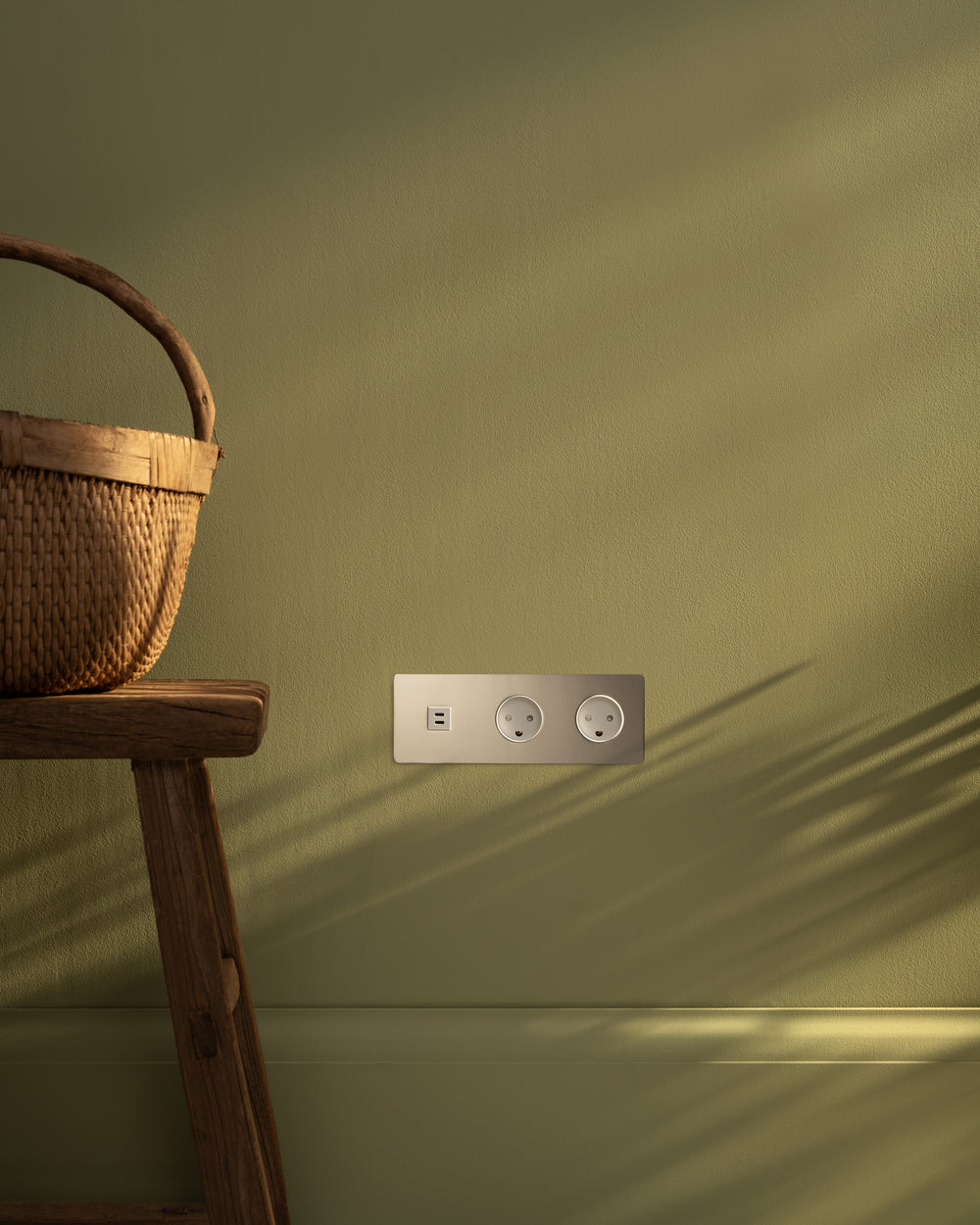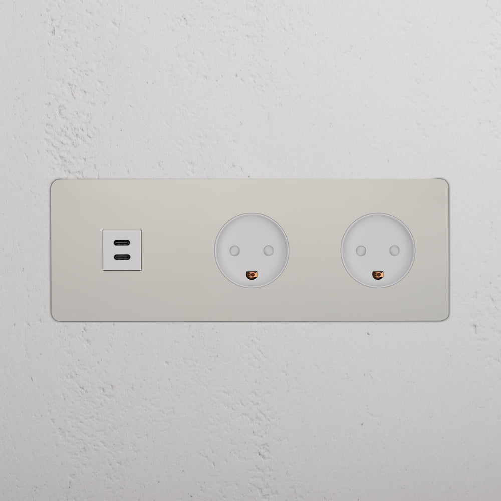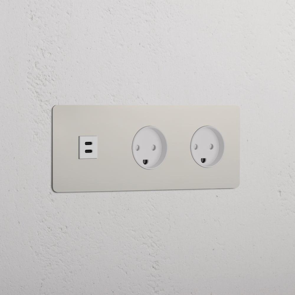 Esta tomada mista tripla combina uma tomada USB-C e duas tomadas dinamarquesas num espelho.
