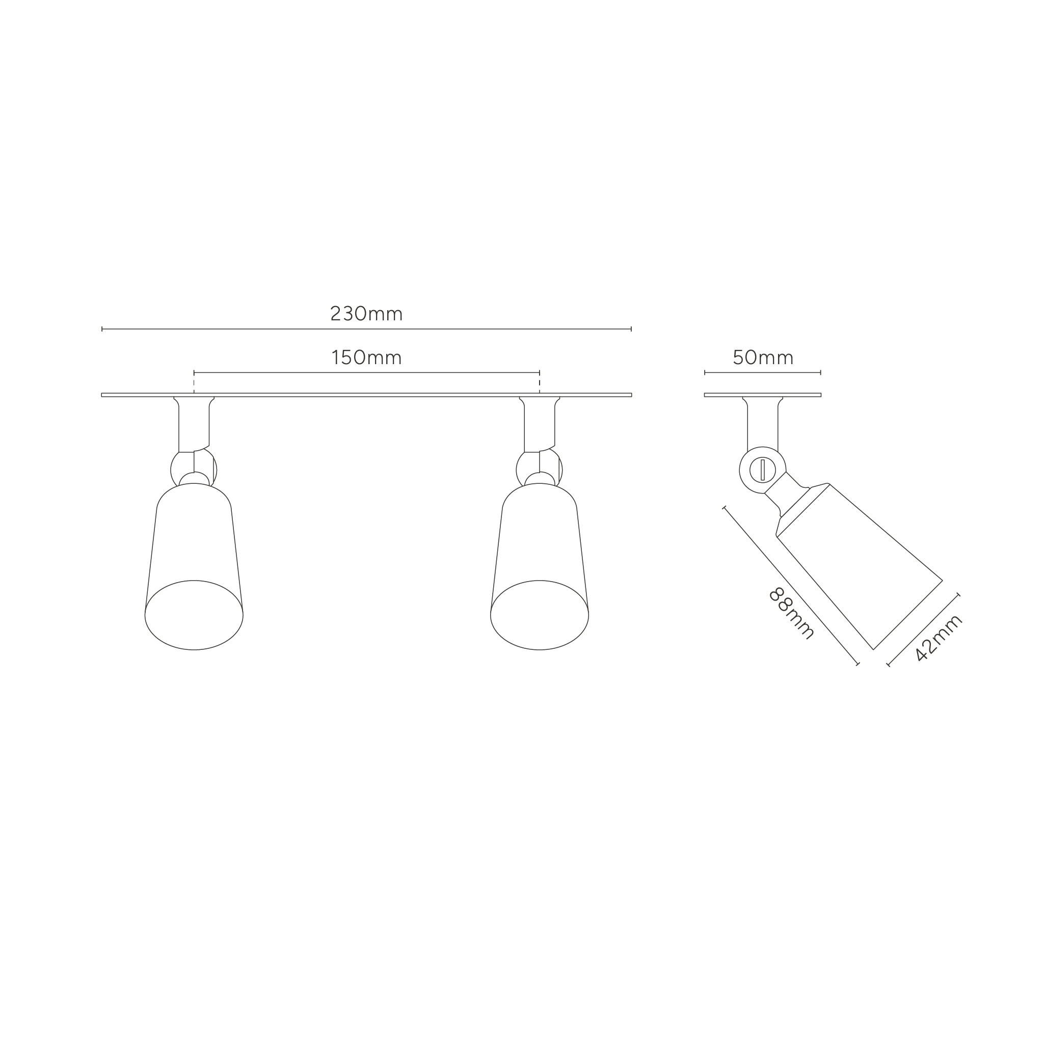 As ligações elétricas no projetor pequeno Perryn duplo estão escondidas, enquanto um mecanismo de mola fixa o espelho de montagem a um teto de gesso cartonado. A suave articulação esférica roda 320° e oferece uma inclinação de 180° para iluminar áreas específicas de uma divisão.