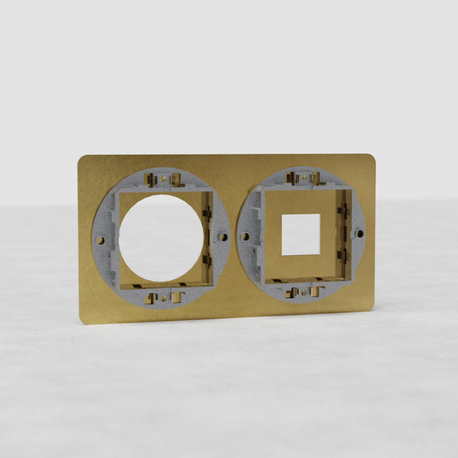 Denna Kew dubbla platta i antik mässing med 1x keystone-öppning och 1x uttagsöppning fungerar med en av våra keystone-moduler på 20 mm och en av våra runda uttagsmoduler.