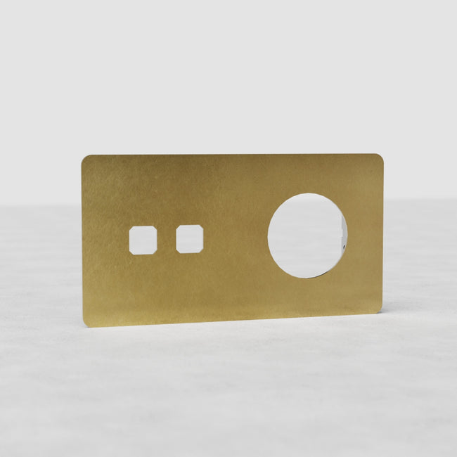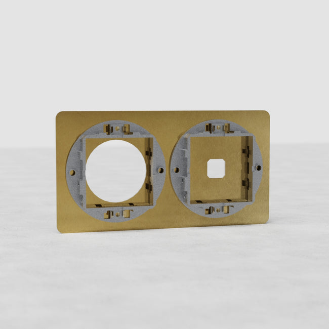 Denna Kew dubbla platta i antik mässing med 2x strömbrytaröppningar och 1x uttagsöppning fungerar med två av våra vippknappar i antik mässing och en av våra runda uttagsmoduler.