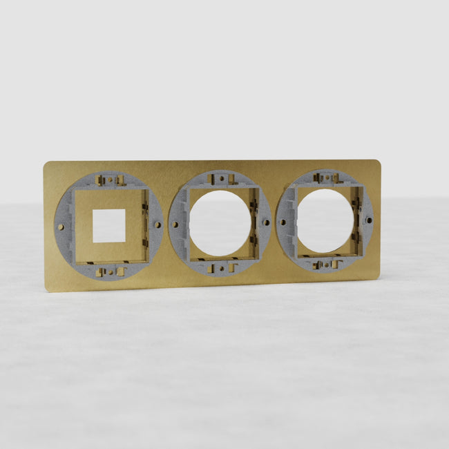 Denna Kew trippla platta i antik mässing med 1x keystone-öppning och 2x uttagsöppningar fungerar med en av våra keystone-moduler på 20 mm och två av våra runda uttagsmoduler.